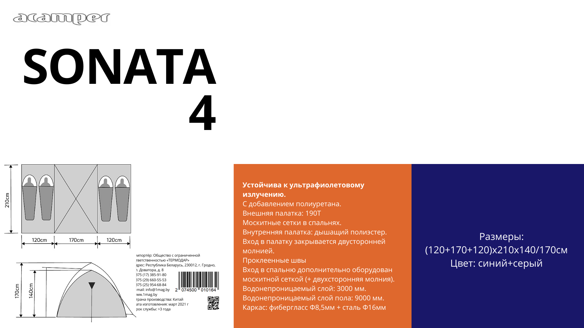 Палатка ACAMPER SONATA 4-х местная, 3000 мм/ст, светло-синяя интересное:
