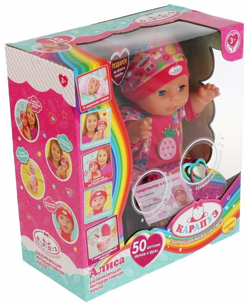 Ниже Вы можете прочитать отзывы на Пупс Карапуз Кукутики Алиса 30см, пьет, писает, горшок, 3 аксессуара, ознакомится с подробными характеристиками, посмотреть интересные обзоры и фотографии на Пупс Карапуз Кукутики Алиса 30см, пьет, писает, горшок, 3 аксессуара.