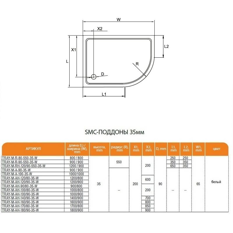 Душевой поддон Cezares 120x90 TRAY-M-RH-120/90-550-35-W-L из стеклокомпозита левый