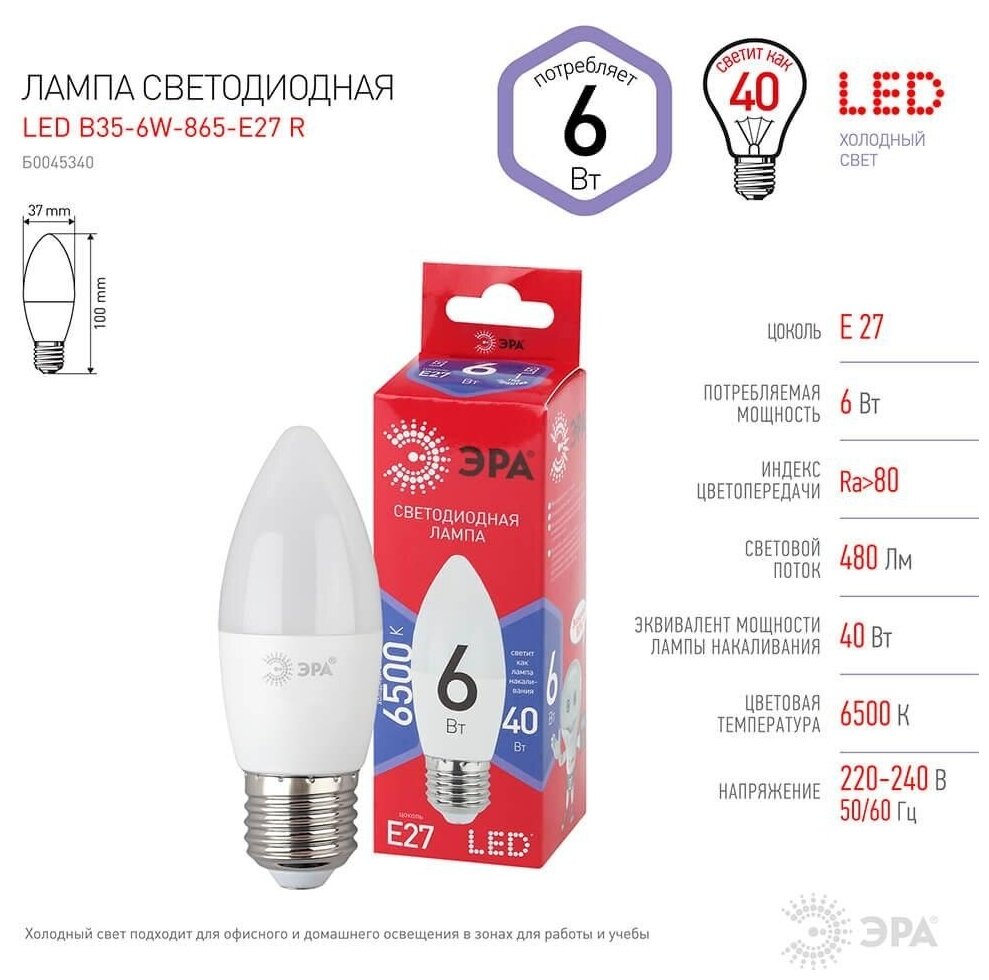 ЭРА ECO свеча B35 E27 6W(480lm) 6500K 6K 100х37 B35-6W-865-E27 5857