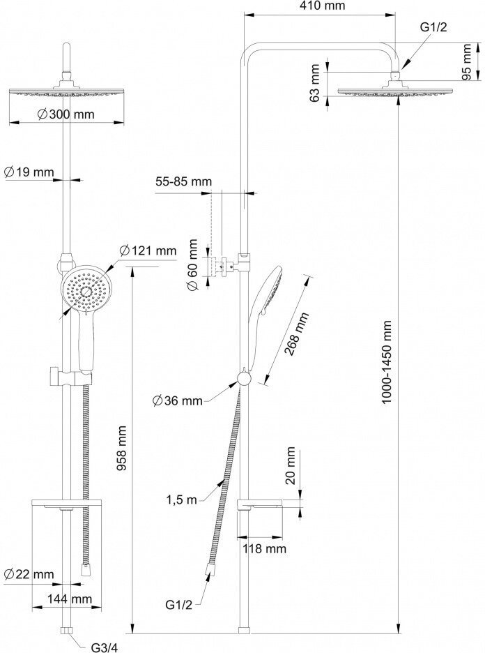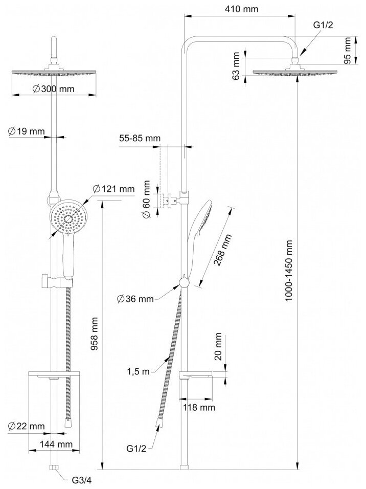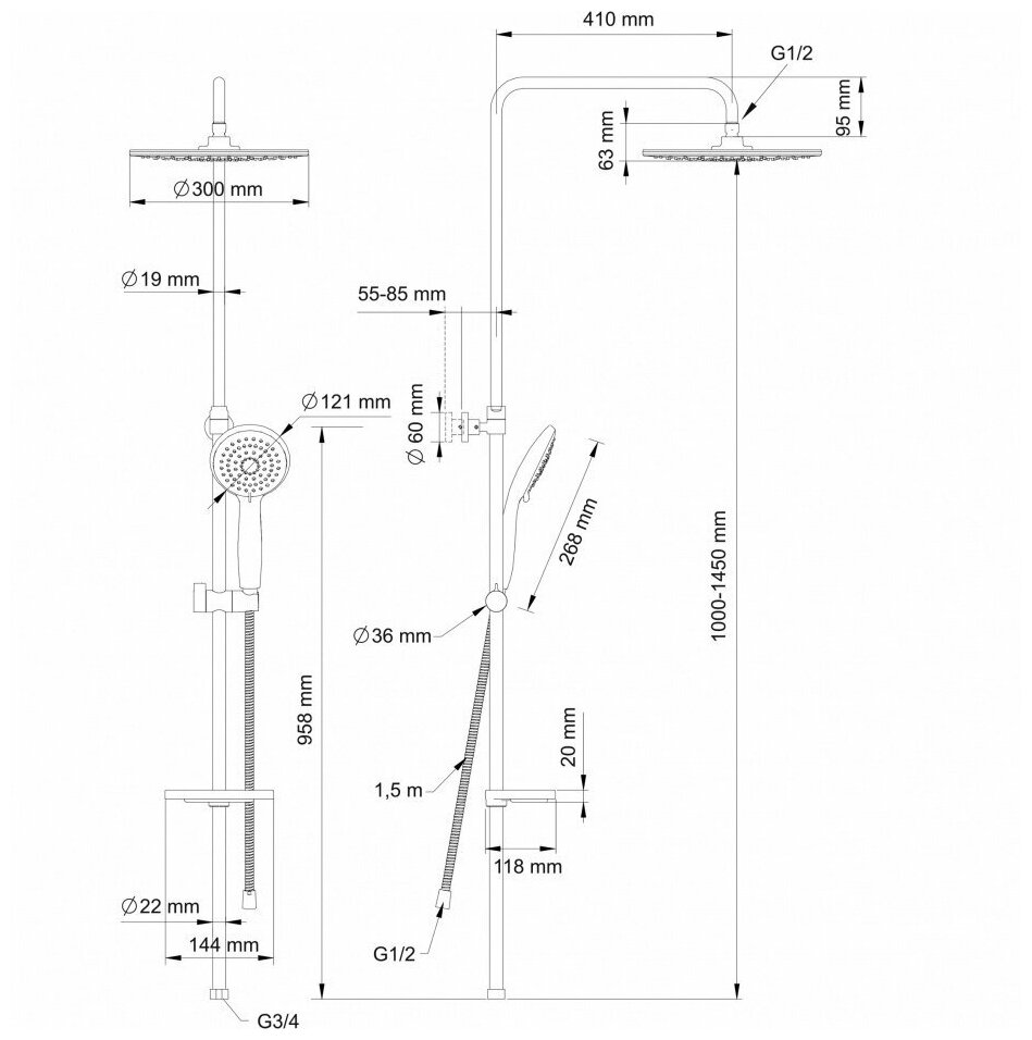 | Особенности | держатель душевой лейки / регулируемый верхний душ |