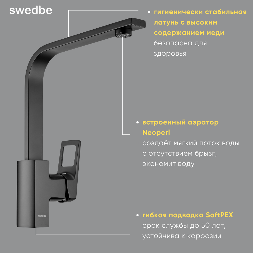 Смеситель для кухни Swedbe Kronos 2041В однорычажный, высокий излив, черный матовый интересное: