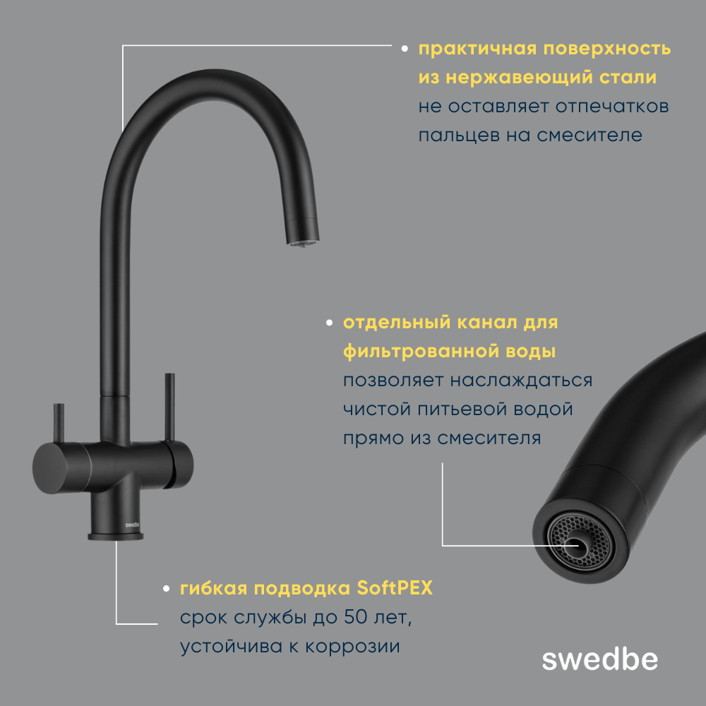 Смеситель для кухни с каналом подключения фильтра воды SWEDBE SELENE PLUS 8042B, черный матовый