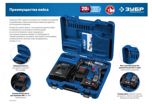 Купить Шуруповерт аккумуляторный ЗУБР Профессионал DL-201-42 (20В, 2 АКБ (4Ач), в кейсе)