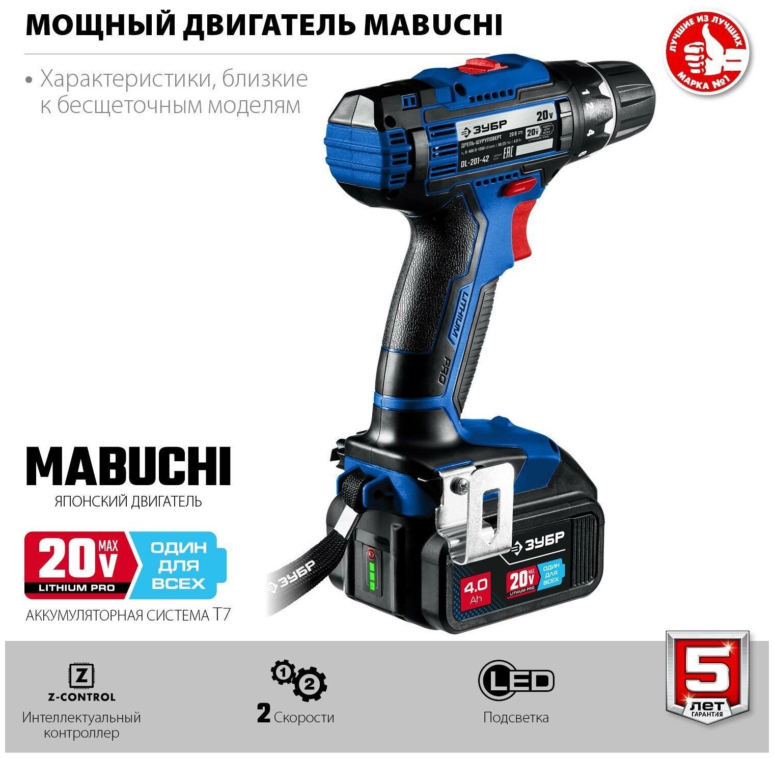 Зубр Дрель-шуруповерт ЗУБР DL-201-42 20В, 2 АКБ (4Ач), в кейсе Профессионал