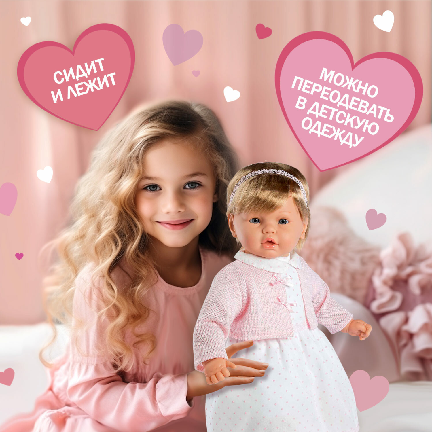 Arias ELEGANCE LEONOR кукла мягкая с виниловыми конечностями, 62 см. Смеется. Короткие волосы. В одежде и с соской. интересное:
