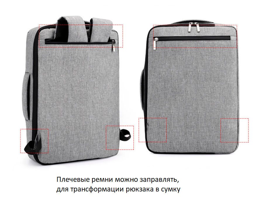 Возможность носить, как сумку, лямки прячутся внутрь. Достаточно места для ноута 15 дюймов, большого блока питания под него, охлаждающей подставки, мыши и ещё что-то влезет. |