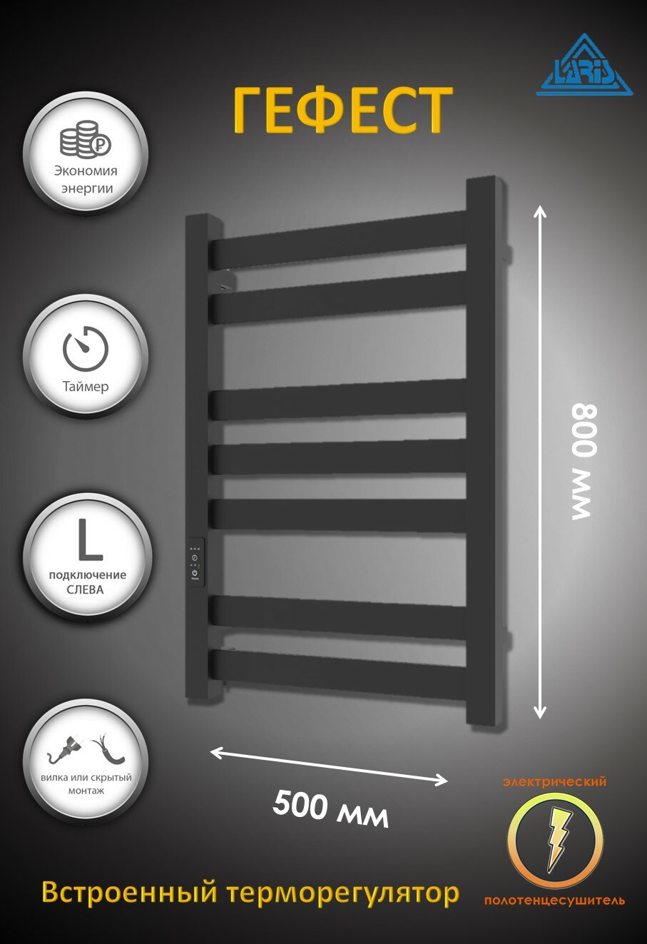Полотенцесушитель электрический Laris Гефест ЧКЧ П7 500мм 800мм черный матовый муар левое подключение с таймером и терморегулятором интересное: