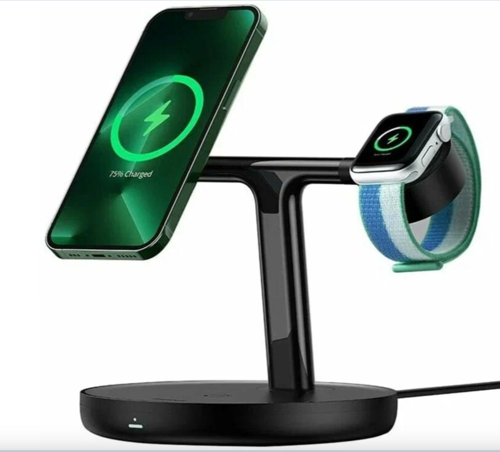 | Плюсы: | Отлично заряжает все устройства (найшники не только от эпл, но и от самсунга нормально заряжает). Эргономичный - провод от зарядки часов помещается в дне. Угол наклона Magsafe регулируется, но часто его менять я бы не стал. Iphone 14 Pro в силиконовом чехле от commo отлично прикрепляется, ничего не мешает. |