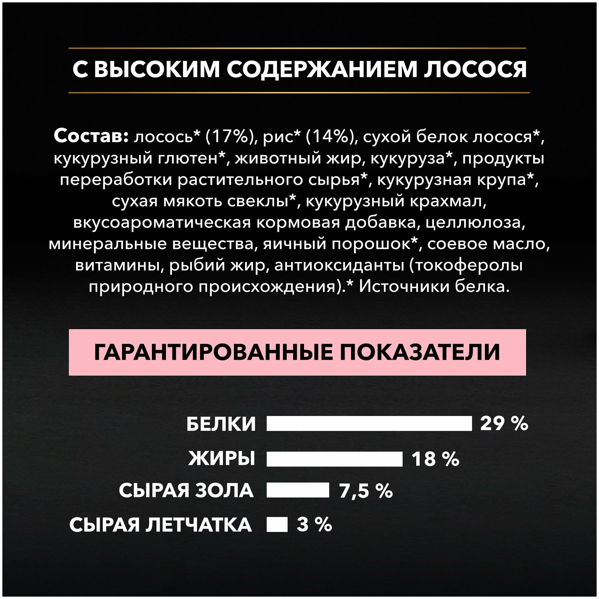 | Состав | лосось* (17%), рис* (14%), сухой белок лосося*, кукурузный глютен*, животный жир, кукуруза*, продукты переработки растительного сырья*, кукурузная крупа*, сухая мякоть свеклы*, кукурузный крахмал, вкусоароматическая кормовая добавка, целлюлоза, минеральные вещества, яичный порошок*, соевое масло, витамины, рыбий жир, антиоксиданты (токоферолы природного происхождения). * Источники белка." |