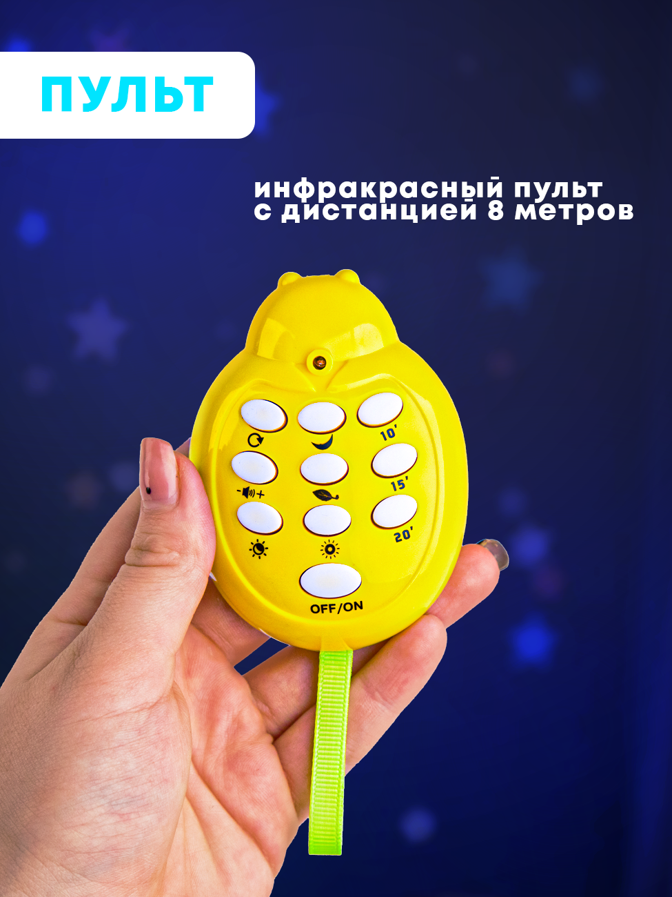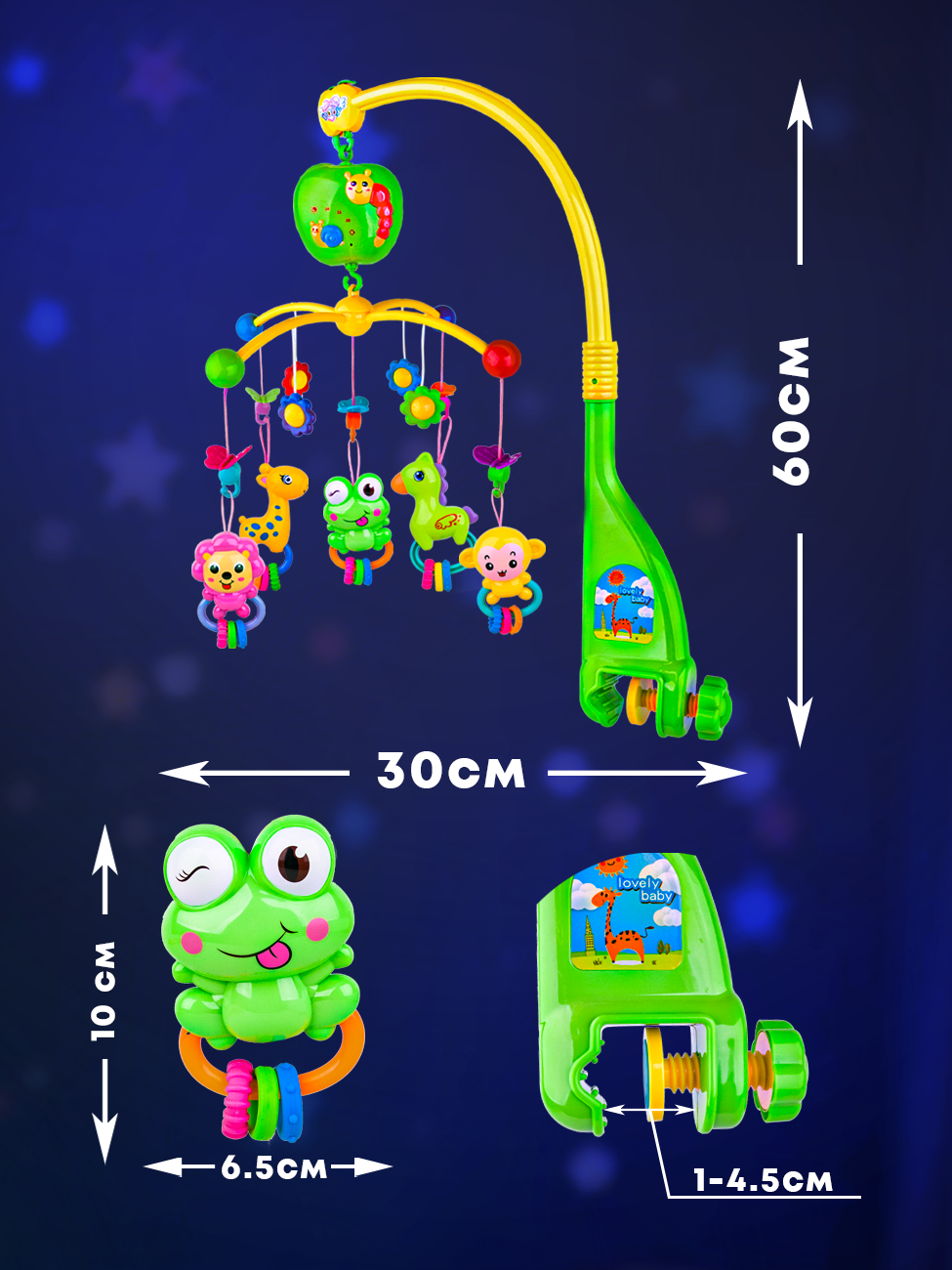 | Особенности | вращение игрушек / звуки природы / звуковые эффекты / ночник / проектор / пульт ДУ / регулировка громкости / световые эффекты / съемные игрушки / таймер автоотключения |