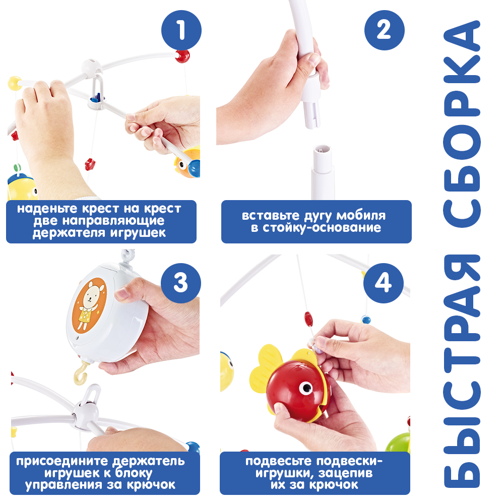 | Дополнительная информация | когда малыш подрастет, рыбок можно будет снять с мобиля и использовать в ванной, во время купания: рыбки не тонут в воде! Хвостики рыбок - это мягкие прорезывали, которые пригодятся малышу в момент появления первых зубов |