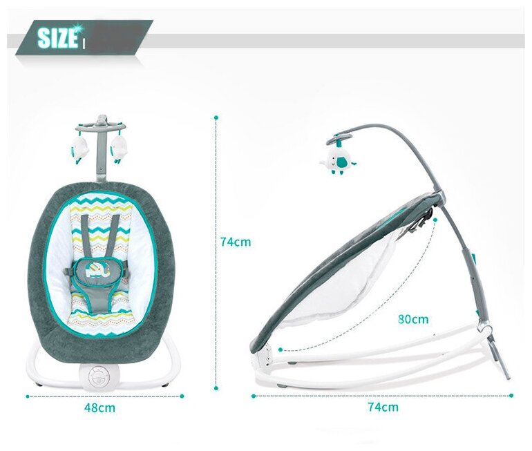 | Комплектация | Кресло-качалка для новорожденных (люлька-качалка для новорожденных), пятиточечные ремни безопасности, виброукачивание, дуга с 2 мягкими игрушками, 15 мелодий. |
