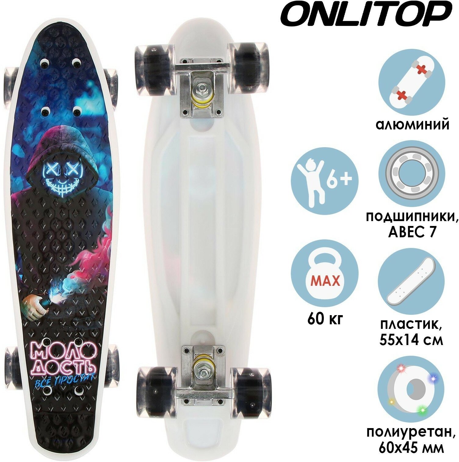 Пенниборд ONLITOP «Молодость», 55х14 см, колёса световые PU 60х45 мм, ABEC 7, алюминиевая рама