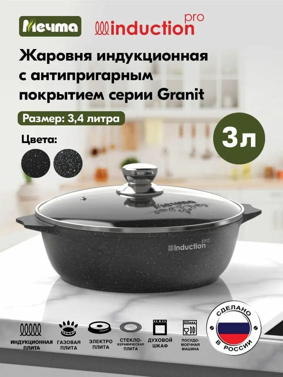 Жаровня Гранит black Induction Pro, 3 л, индукция, стеклянная крышка, антипригарное покрытие Мечта .