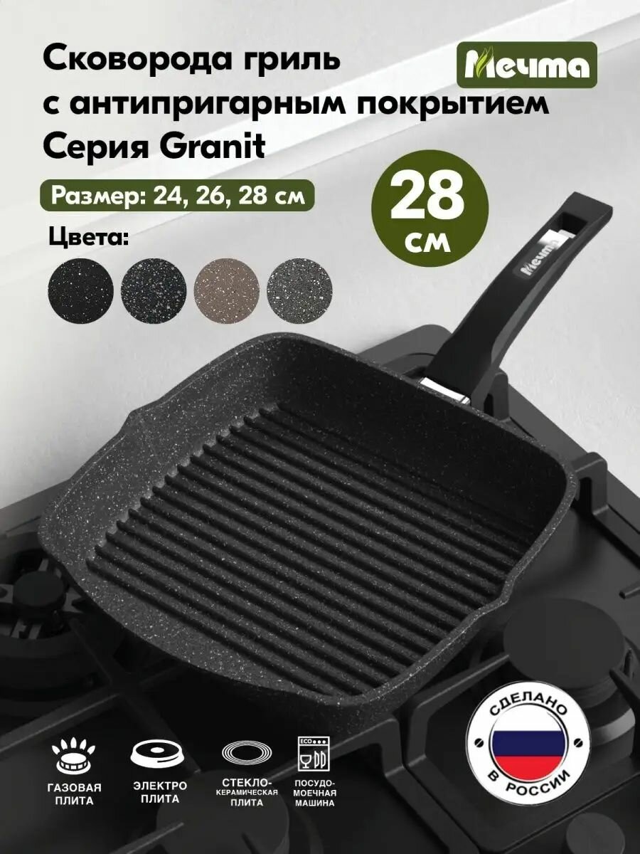 Сковорода-гриль квадр. "Мечта" 28*28см Гранит с антипригарным покрытием с несъемной ручкой, можно мыть в посудомоечной машине