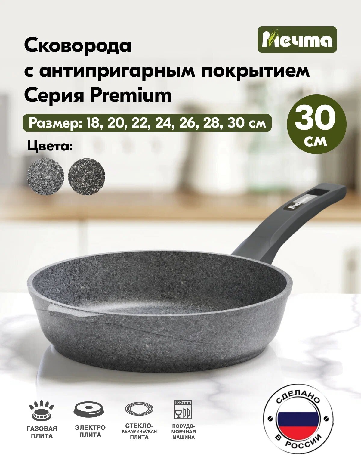 Сковорода "Мечта" 30см Премиум с антипригарным покрытием с несъемной ручкой, можно мыть в посудомоечной машине интересное: