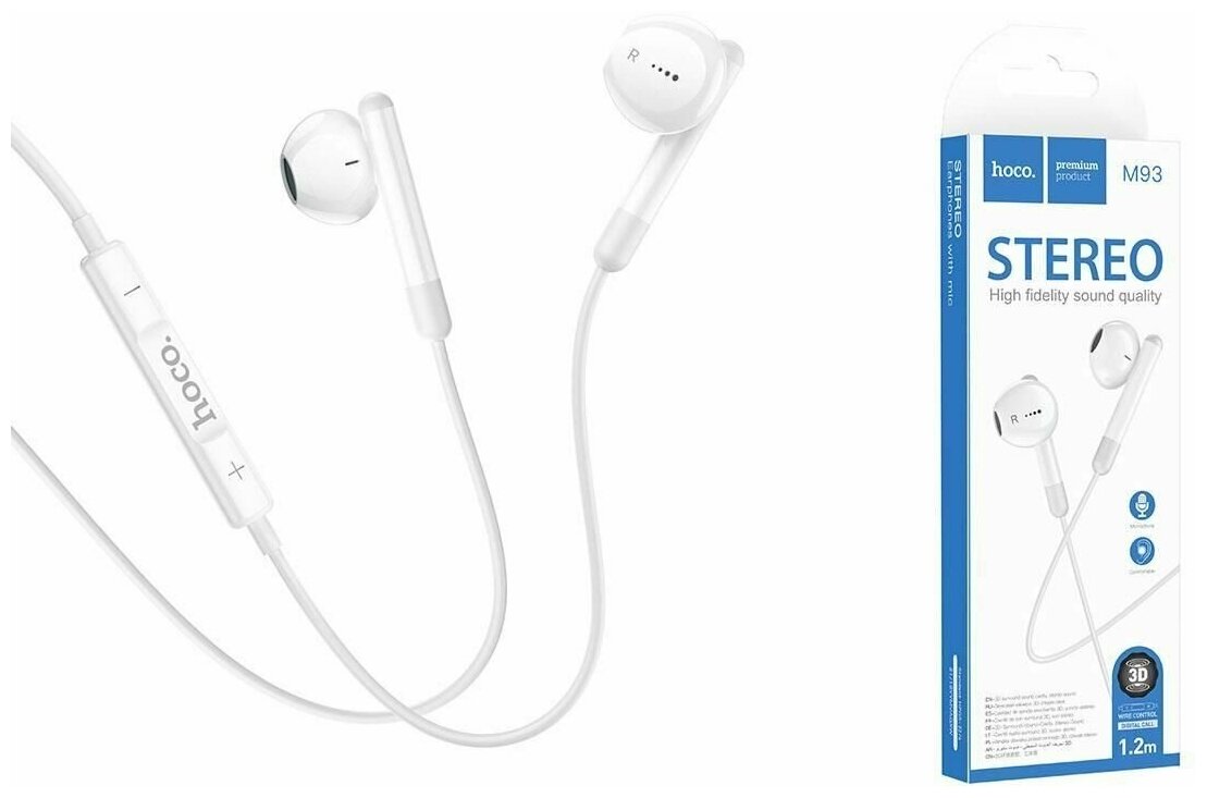 Проводные наушники HOCO M93, Jack 3.5mm, 1.2 м, белый, контроллер с микрофоном