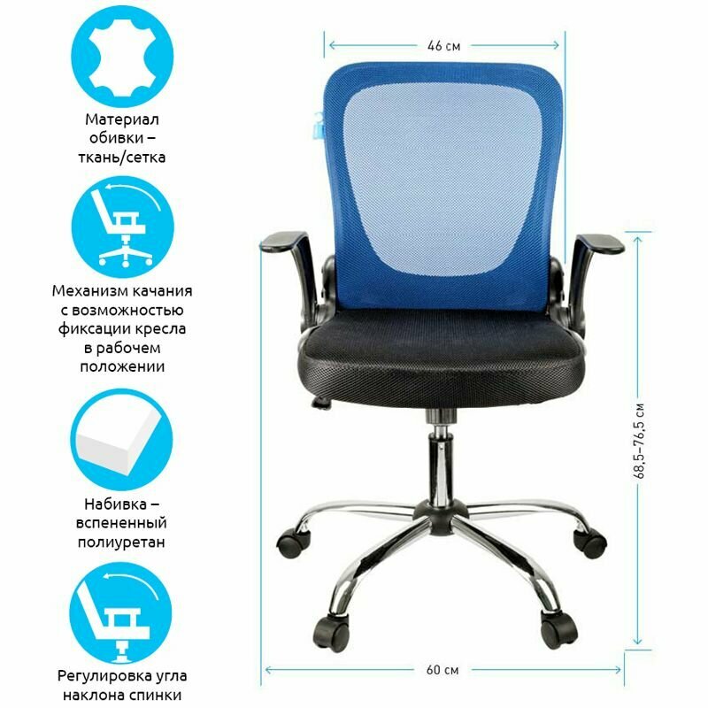 Кресло оператора Helmi HL-M04 "Active", ткань, спинка сетка синяя/сиденье TW черн, рег. подлокот, хром