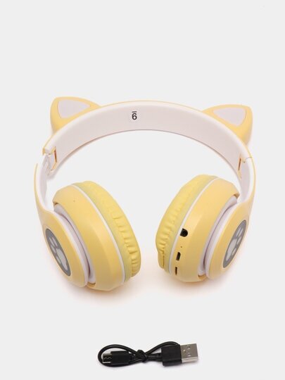 Беспроводные наушники со светящимися ушками CAT, желтые/ Светящиеся наушники с ушками/ Детские беспроводные наушники/ Bluetooth наушники