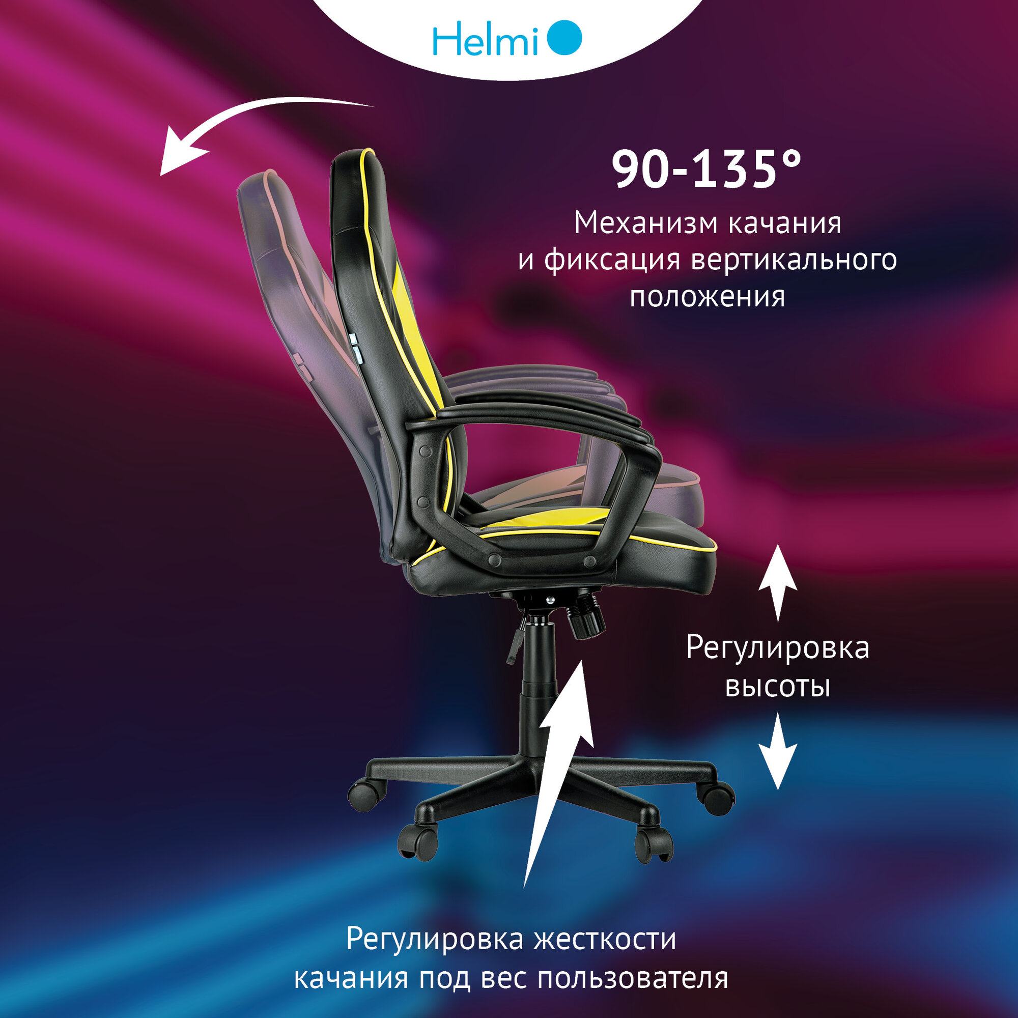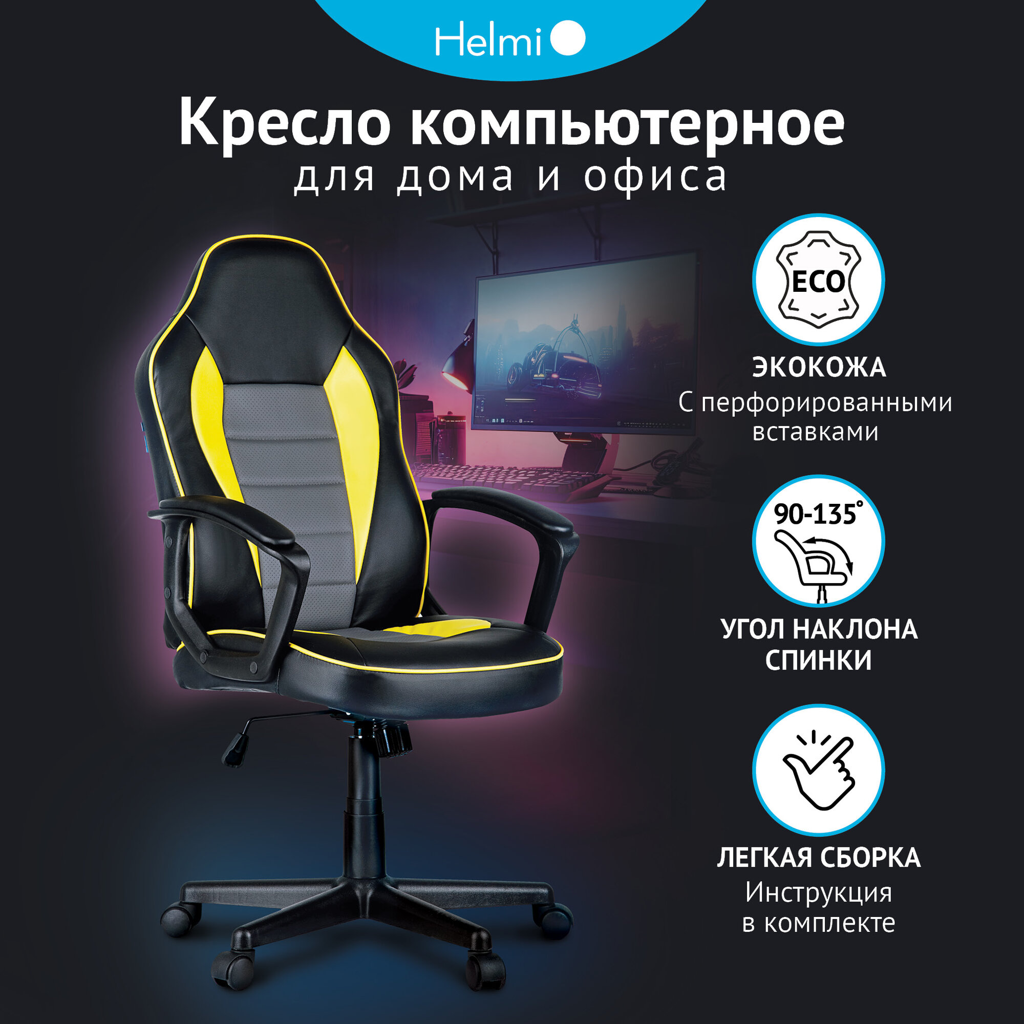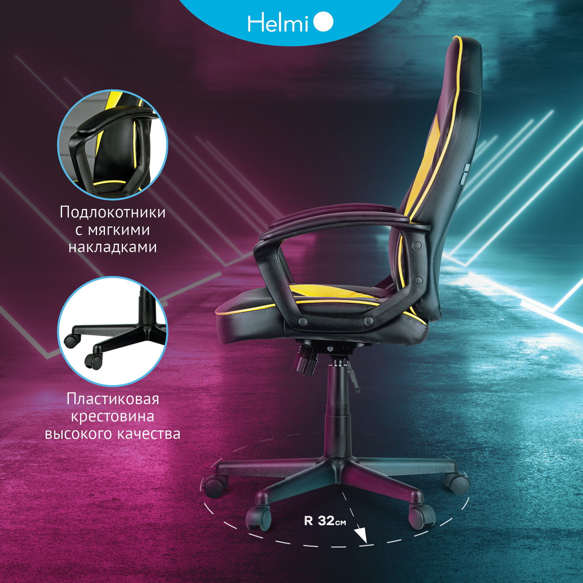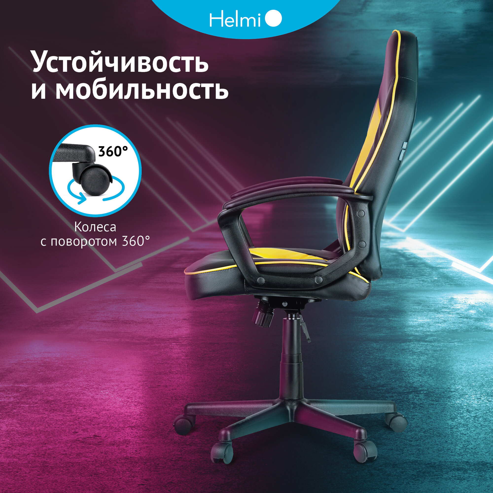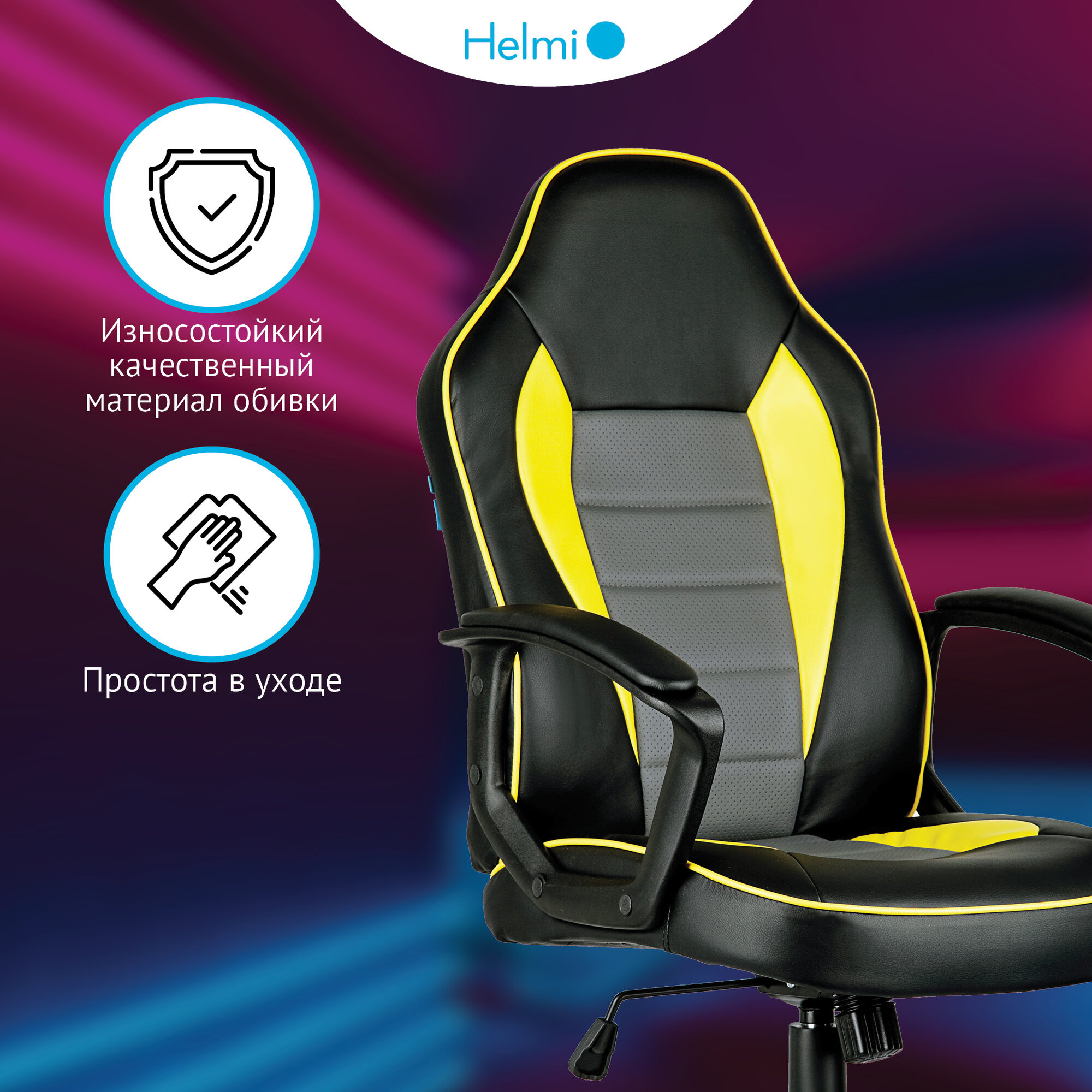 Кресло игровое Helmi "Rally", экокожа черная, серая, желтая (297636)