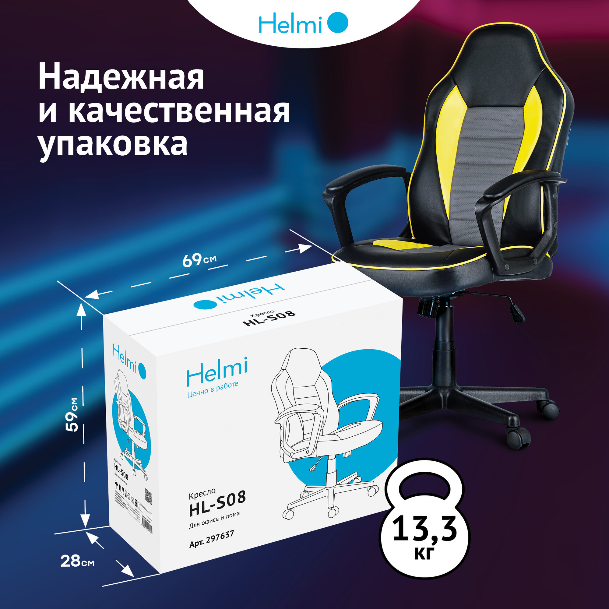 Кресло игровое Helmi HL-S08 "Rally", экокожа черная/серая/желтая