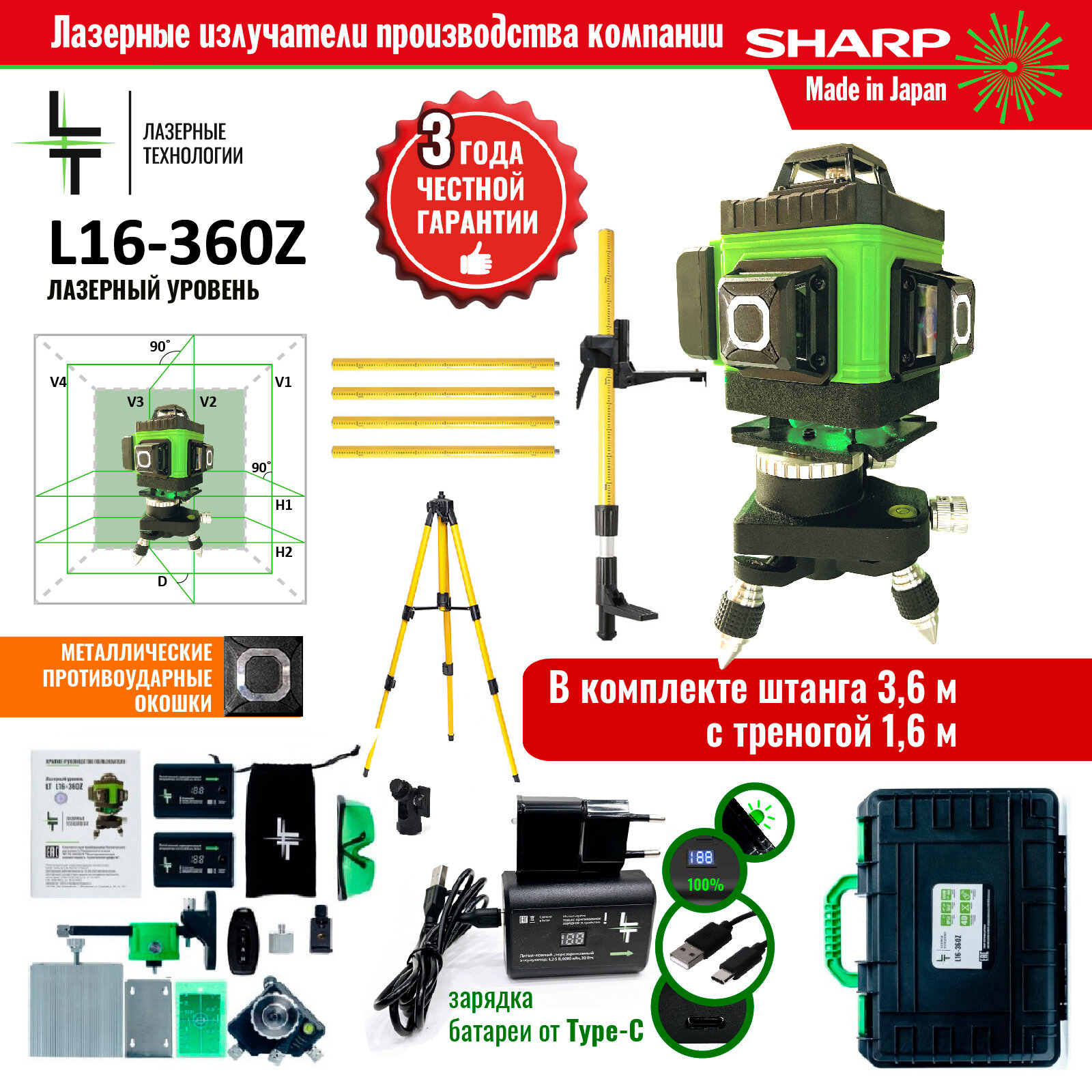 Профессиональный Лазерный уровень (нивелир) "LT" 4D 16 линий 2 Li-Ion акб + штанга 3.6м + тренога 1.6м интересное: