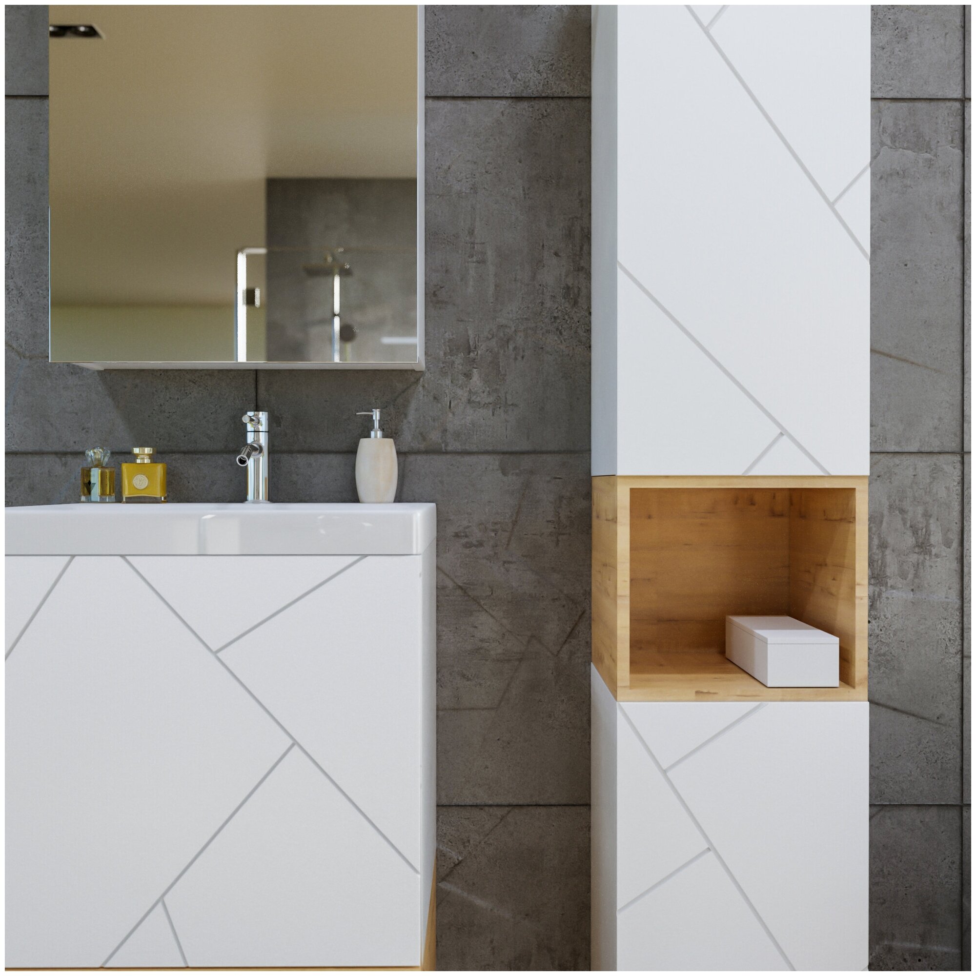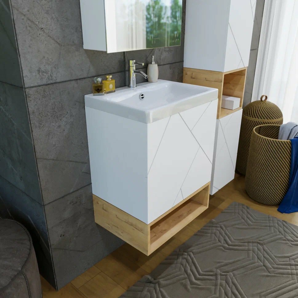 Тумба с раковиной для ванной Кристалл 50 с нишей, Латте/дуб крафт табачный