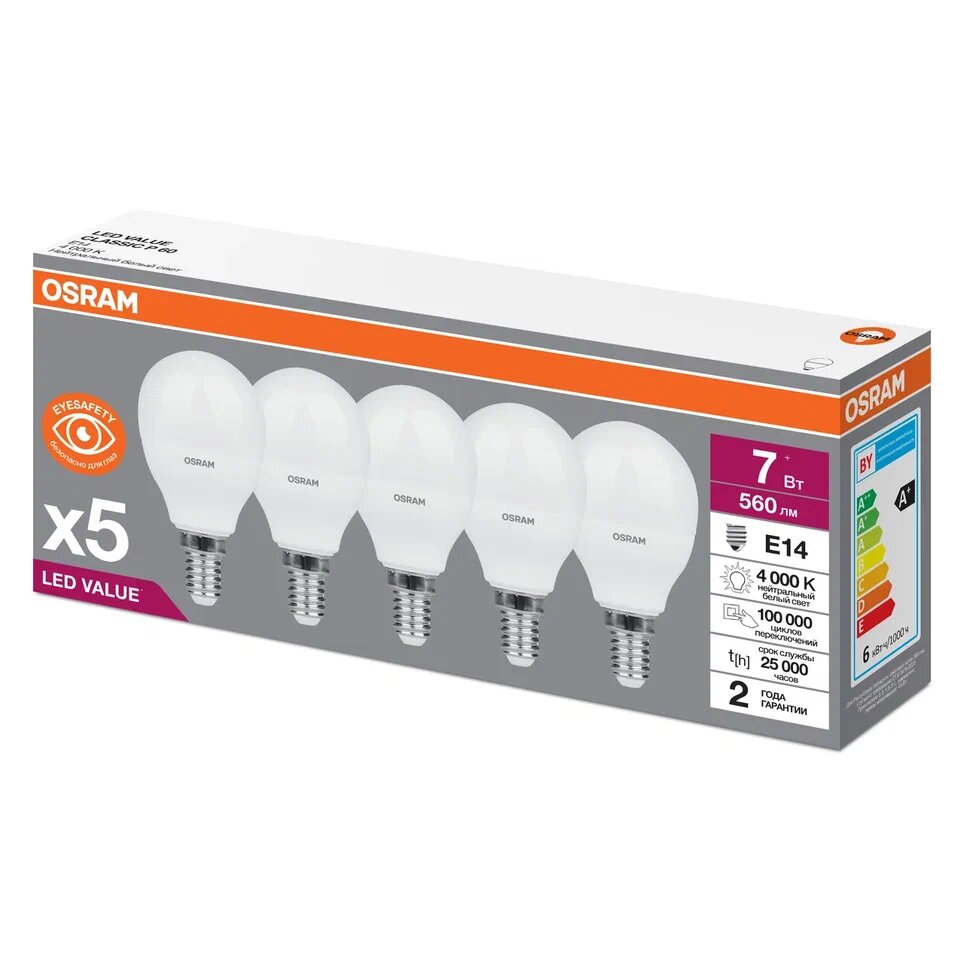 Лампочка светодиодная OSRAM LED Value E14 4000К P шар 7Вт 560Лм 4058075578135 (упаковка из 5 шт)