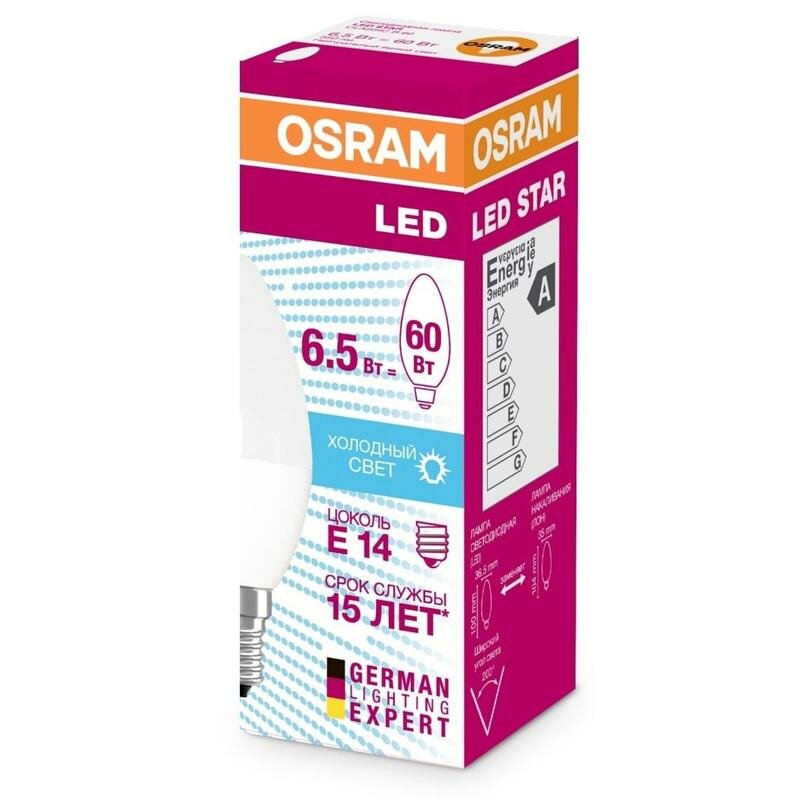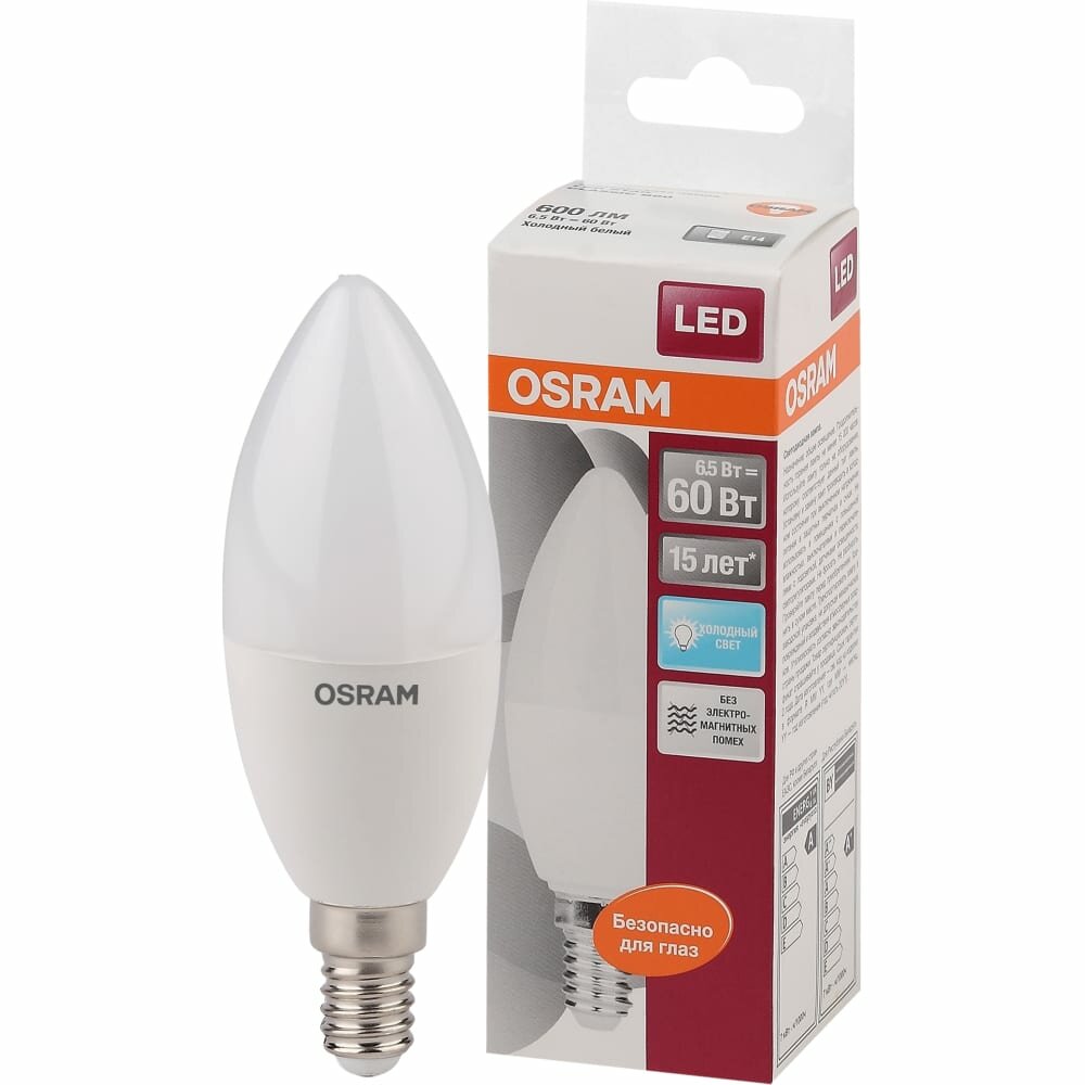 Лампа OSRAM LED Star E14 свеча B C37 6.5Вт, светодиодная LED, 550 лм, эквивалент 60Вт, нейтральный свет 4000К
