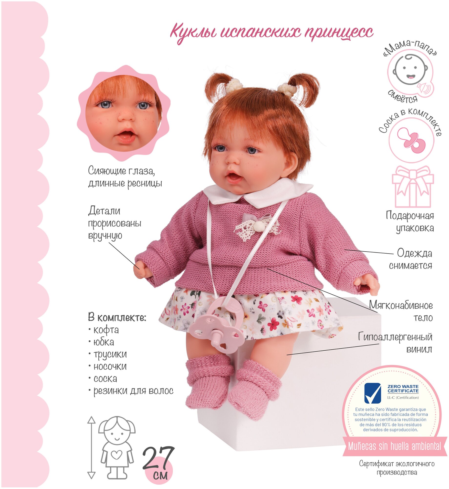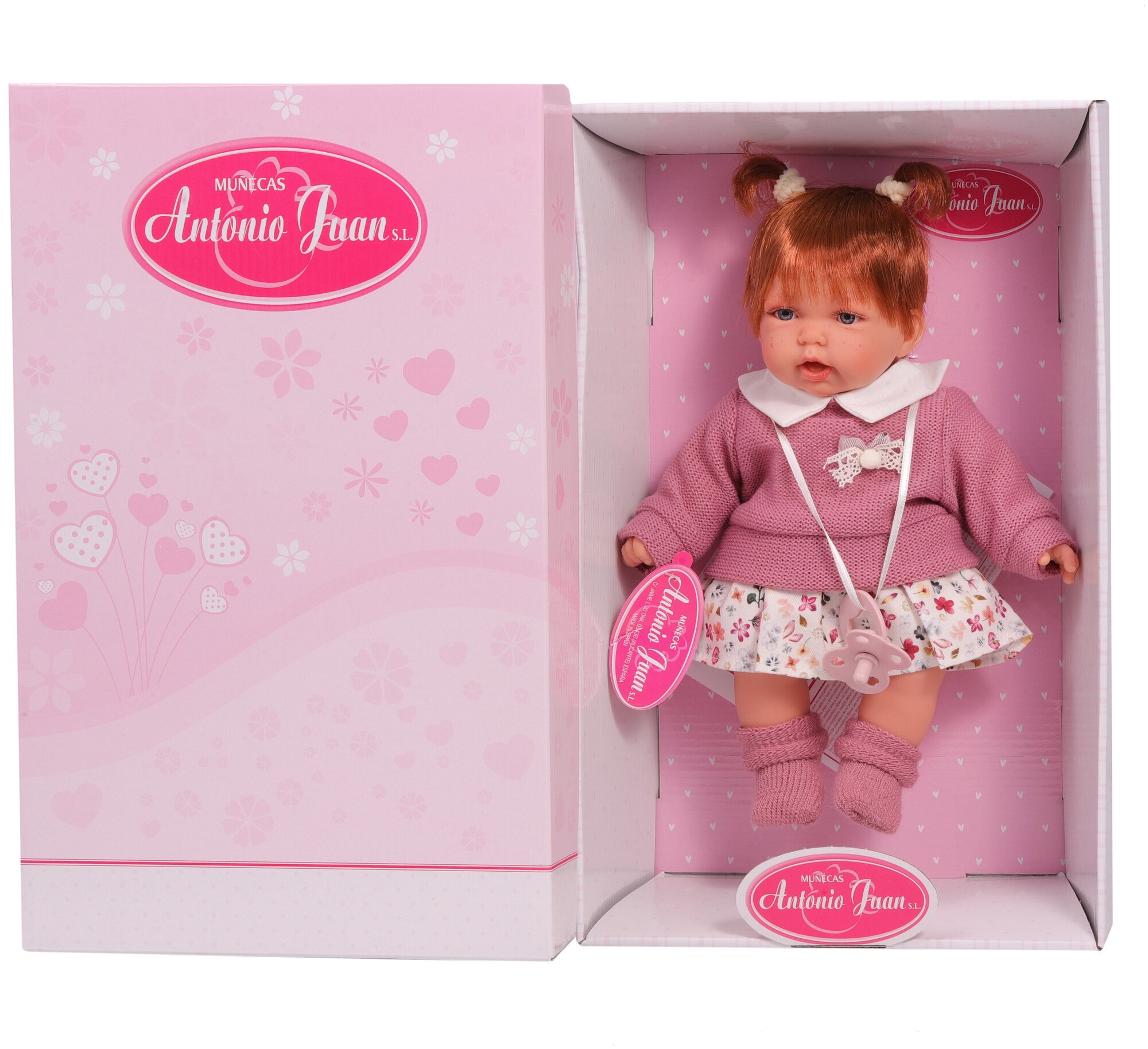 | Дополнительная информация | куклы производятся исключительно в Испании с 1958 года экологичное производство, сертификат Zero Waste производятся из гипоаллергенных материалов без отдушек, безвредных для ребенка образы кукол вдохновлены испанскими принцессами куклы высокохудожественны, одеты в красивую современную одежду, упакованы в подарочные фирменные коробки все детали на личиках и телах кукол четко прорисованы, что придает им неповторимую схожесть с настоящими малышами для кукол можно приобрести дополнительные наборы одежды MUNECAS DOLLS Antonio Juan, а также коляски, мебель и другие аксессуары от бренда-партнера DeCuevas TOYS (Испания) |