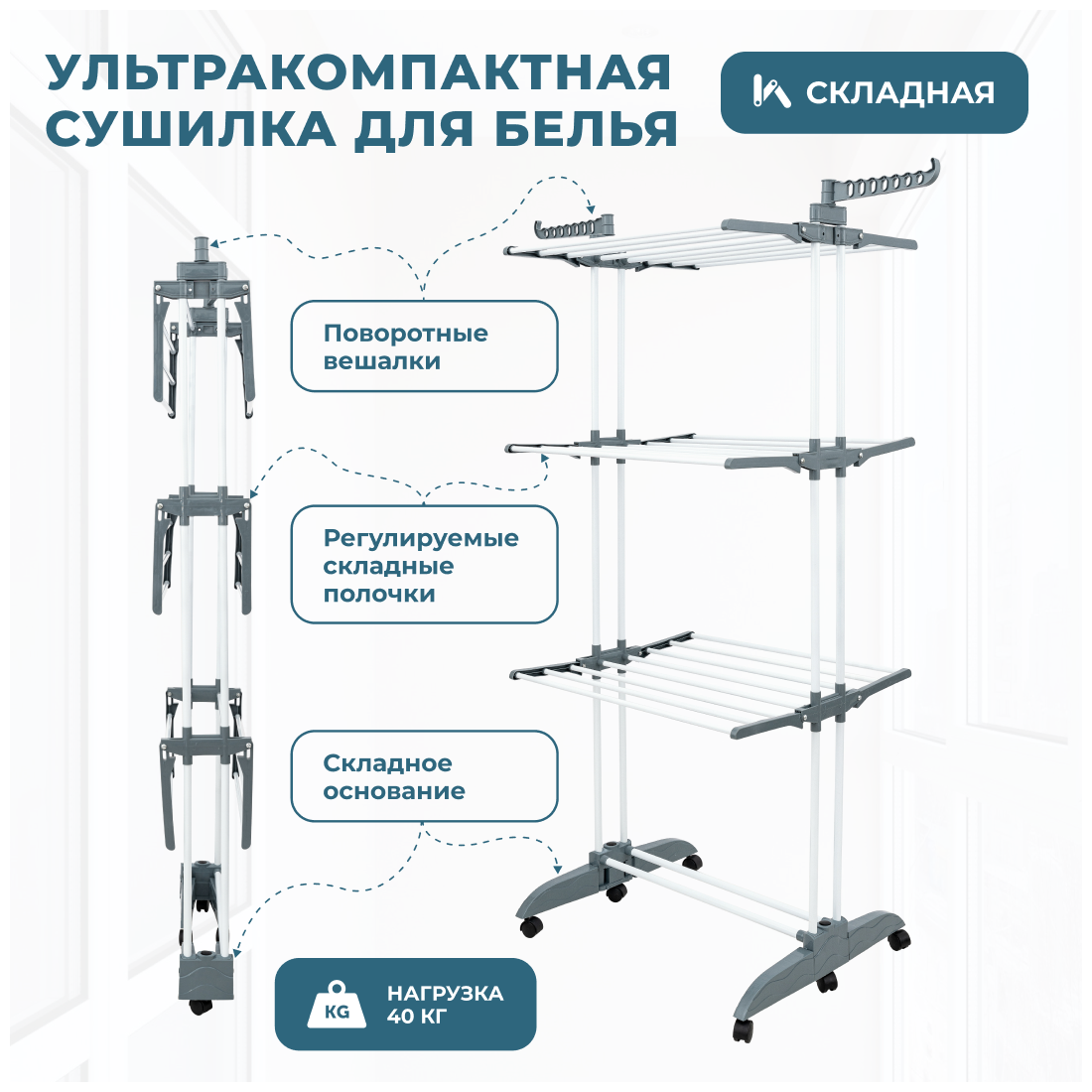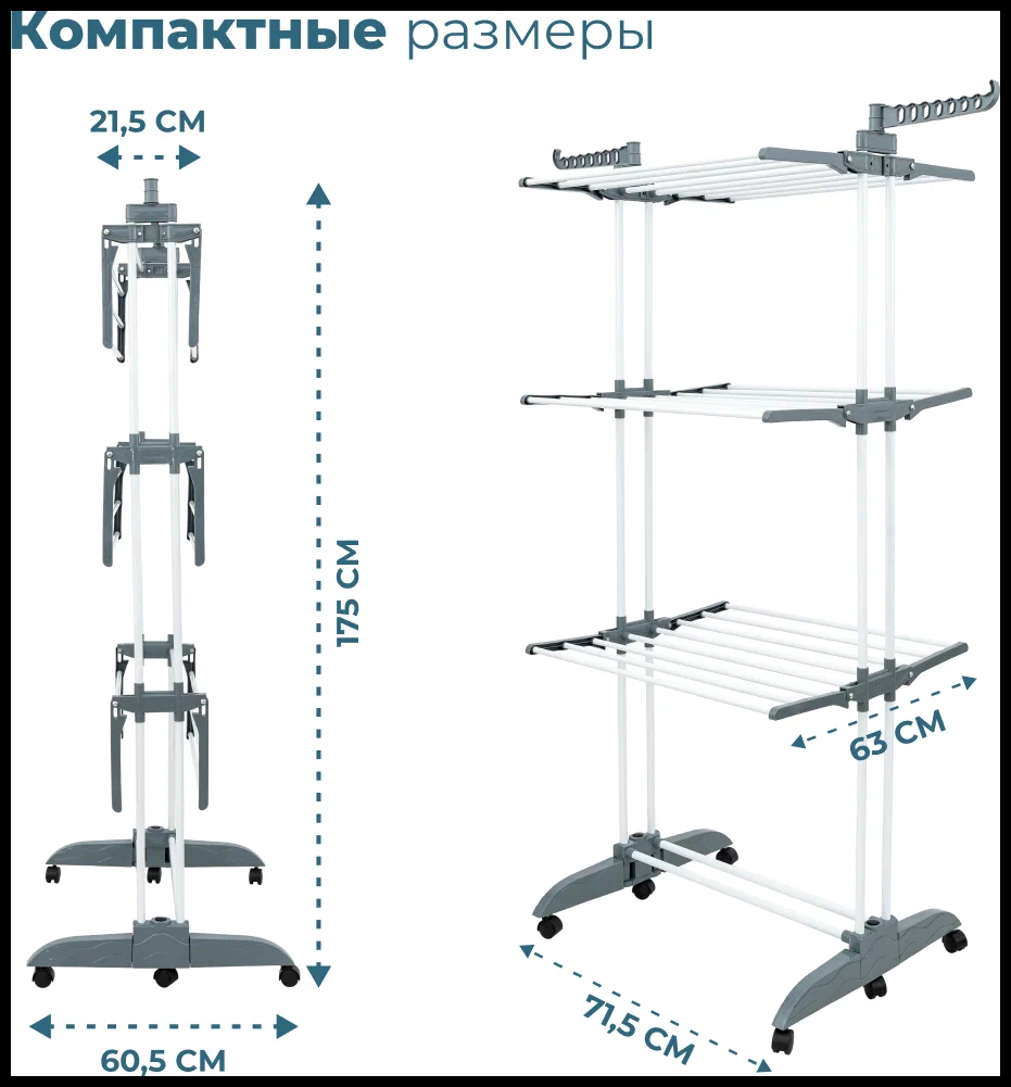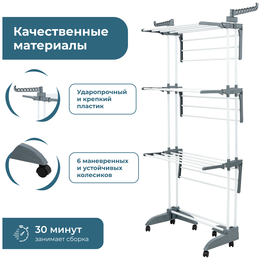 Складная сушилка для белья UniStor WINGS на колёсиках, трехярусная, с дополнительными держателями 211546