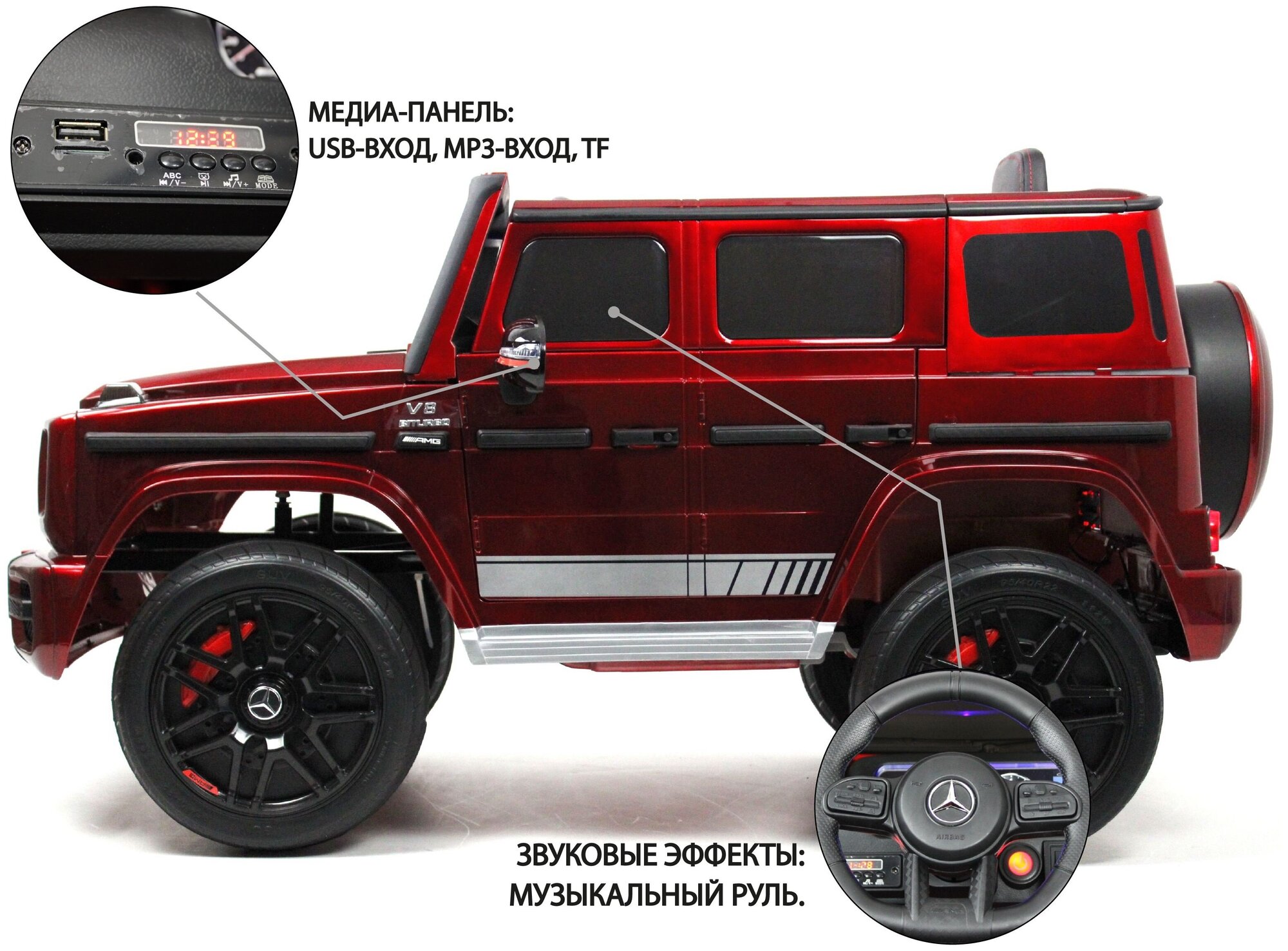 Детский электромобиль Mercedes-Benz G63 лицензия, кожа, EVA, пульт, свет, звук вишня интересное: