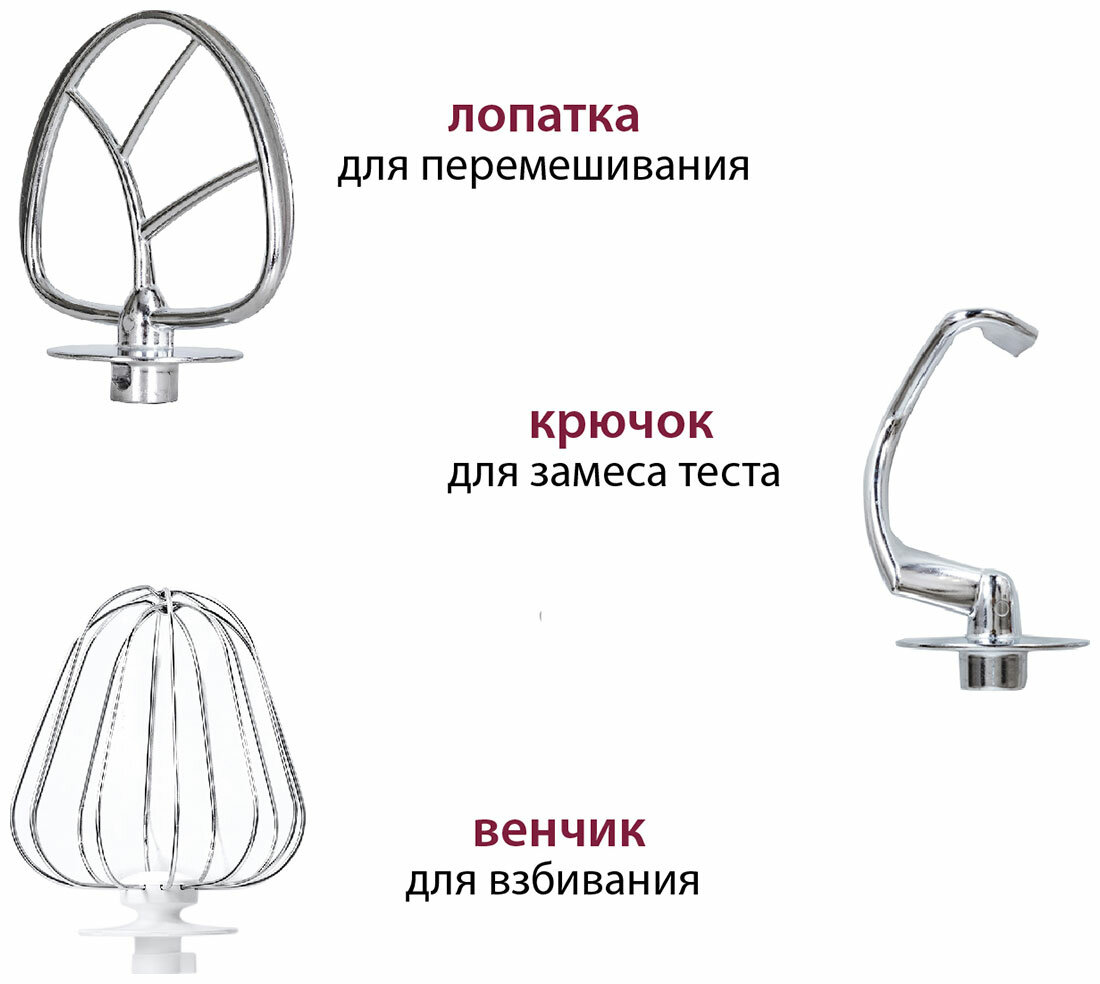 | Насадки | венчик для взбивания / крючки для замешивания теста / лопатка |