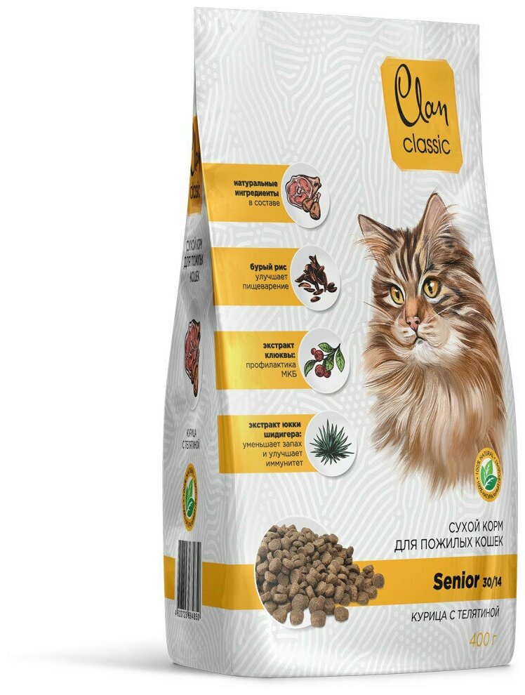 Корм для кошек сухой CLAN Classic Senior 30/14 для пожилых кошек, курица и телятина, 400г