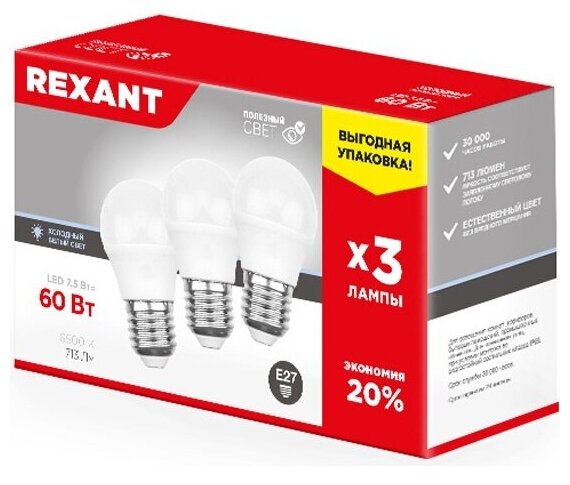 Купить Светодиодная лампа REXANT Шар E27, 7.5 Вт, 713 Лм (=60 Вт), 6500 K (холодный свет), упаковка 3 шт.