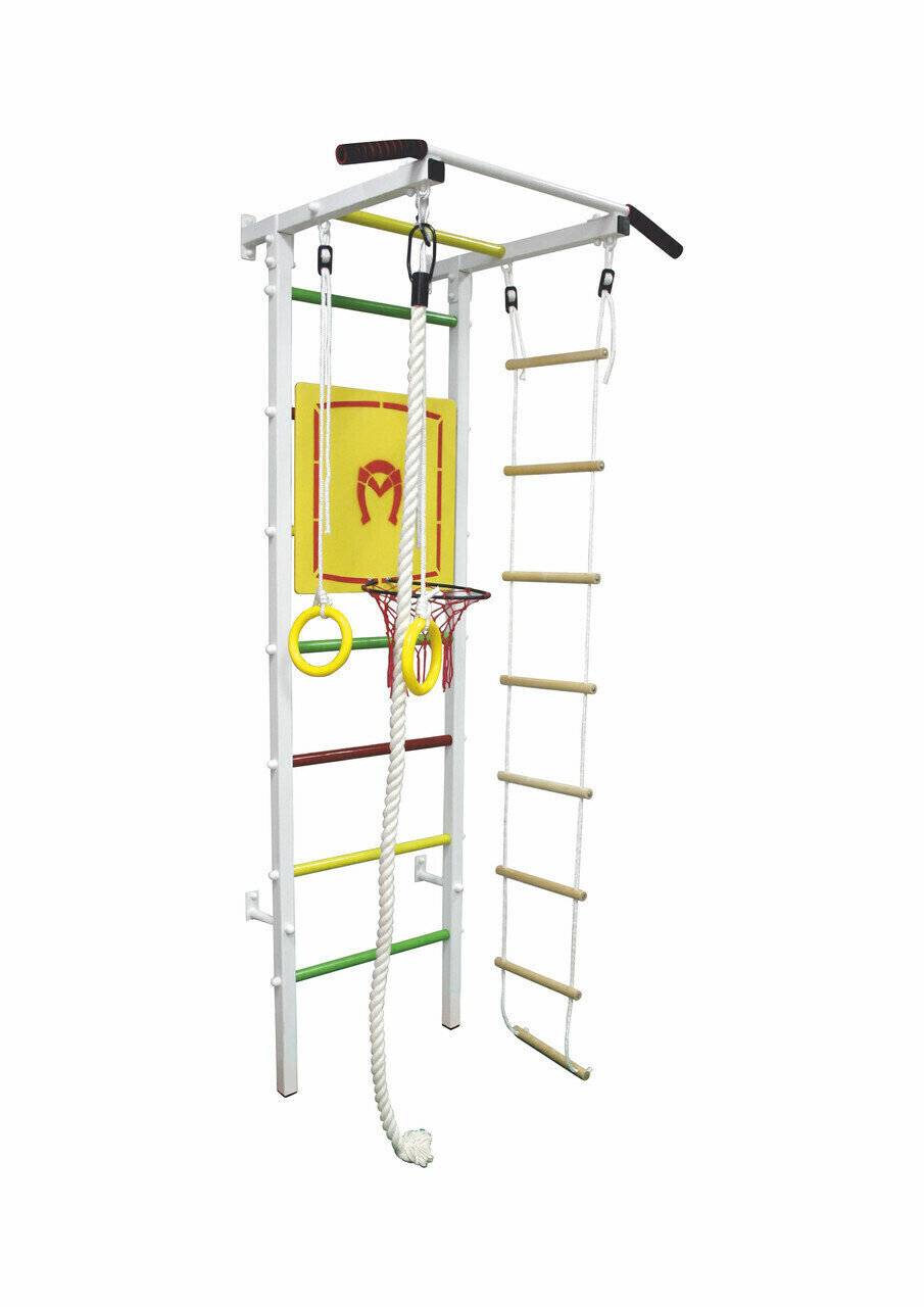 | Комплектация | стенка металлическая, турник стационарный, кольца пластиковые, веревочная лестница, канат детский, баскетбольный щит большой: 50*50 см. |