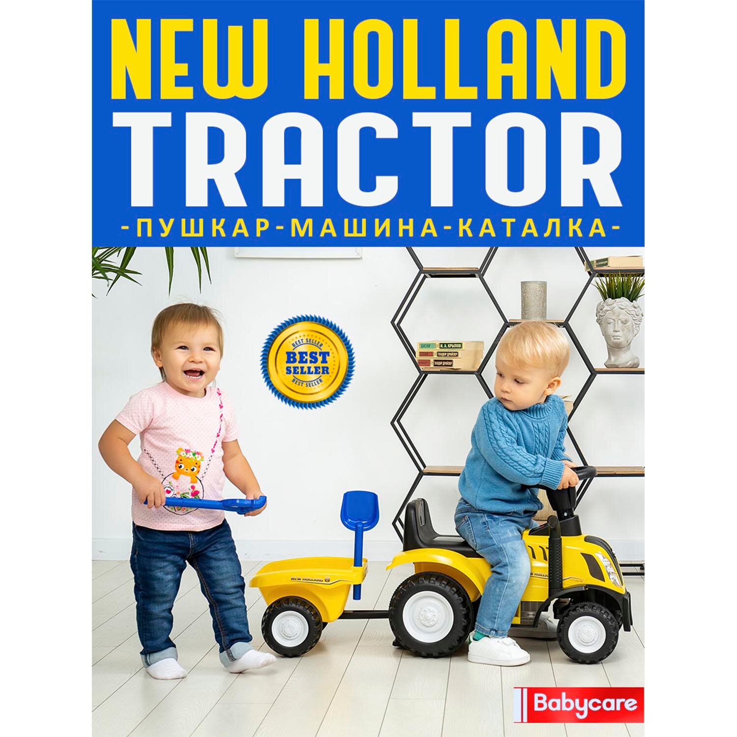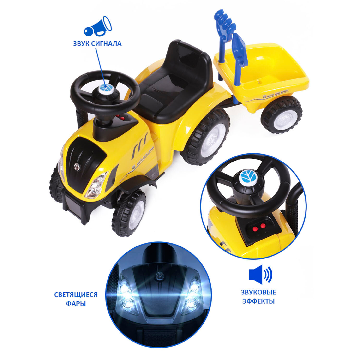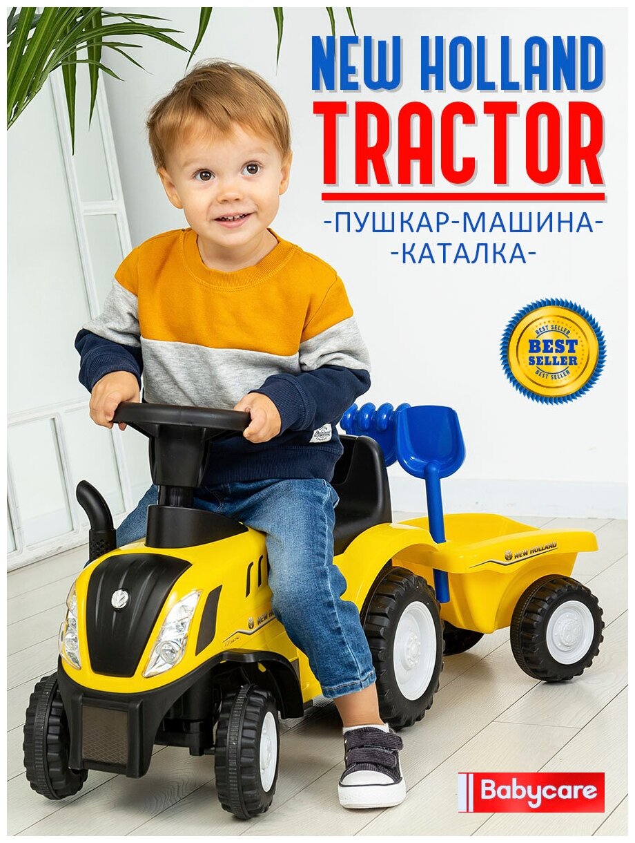 Пушкар машина-каталка детская New Holland Tractor Babycare, звуковые эффекты, желтый интересное: