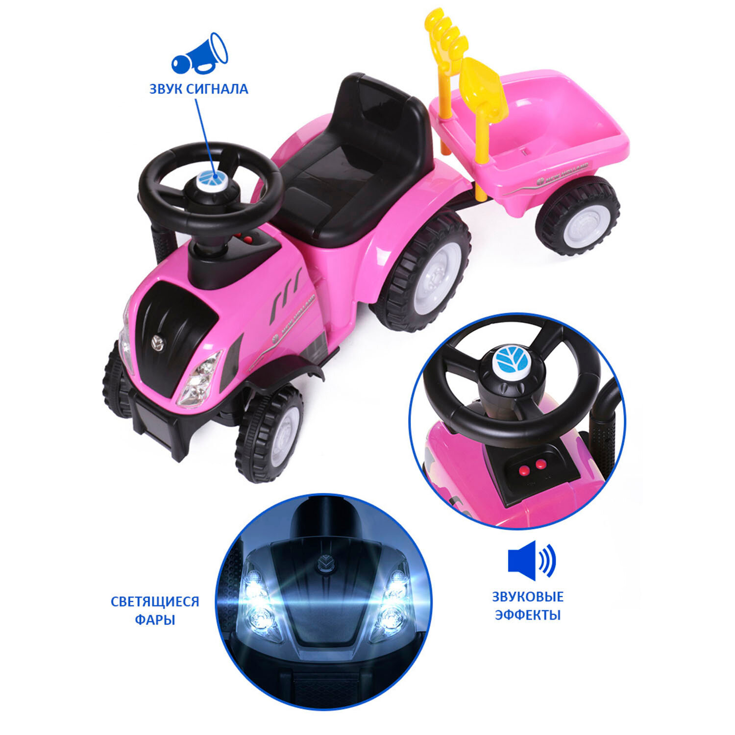 Пушкар машина-каталка детская New Holland Tractor Babycare, звуковые эффекты, розовый интересное: