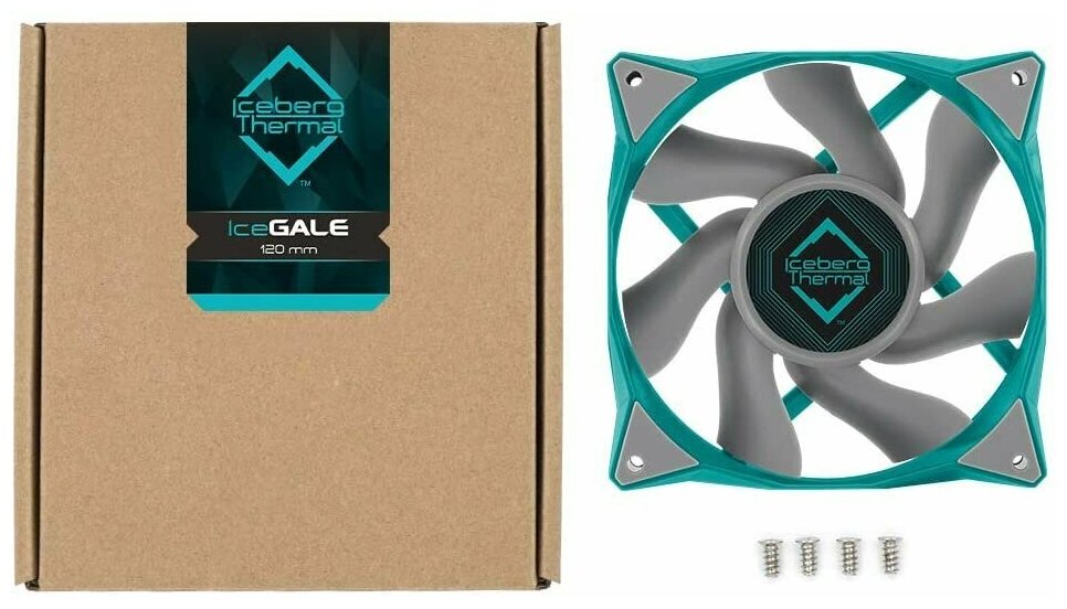 | Комплектация | Вентилятор Iceberg Thermal IceGALE 120 Teal, IceGALE_120mm_TEAL - 1 Шт. винт - 4Шт |