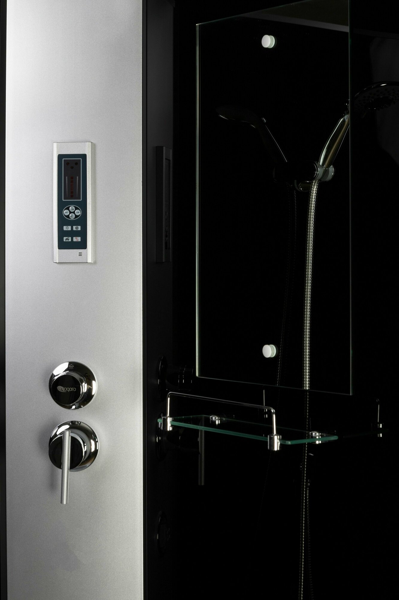 | Комплектация | душевая лейка, зеркало, поддон, полки, сиденье |