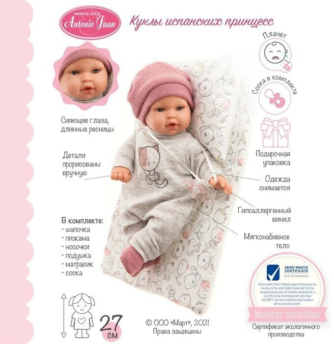 | Комплектация | кукла, шапка, пижама, носочки, подушка, матрас, соска |