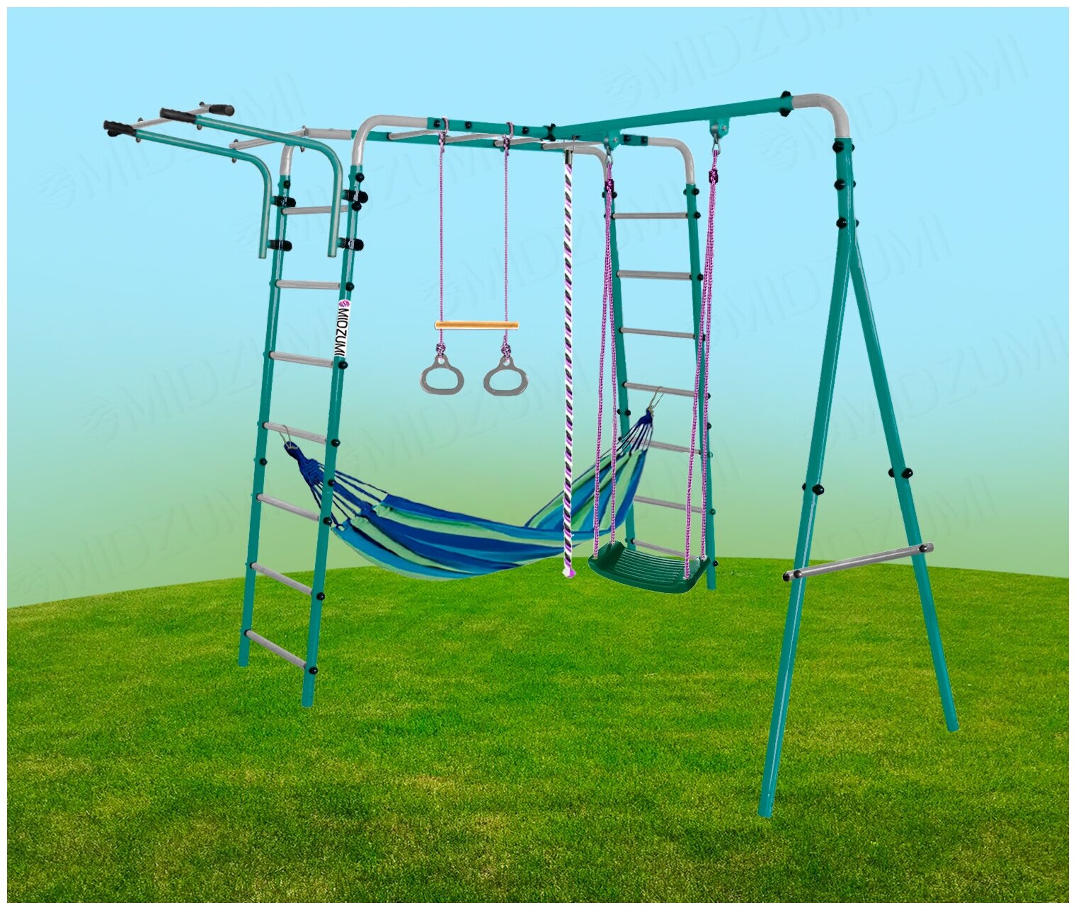 | Комплектация | спортивный комплекс с рукоходом, передвижной турник, кольца с перекладиной, качели без спинки, подвесной гамак, канат |