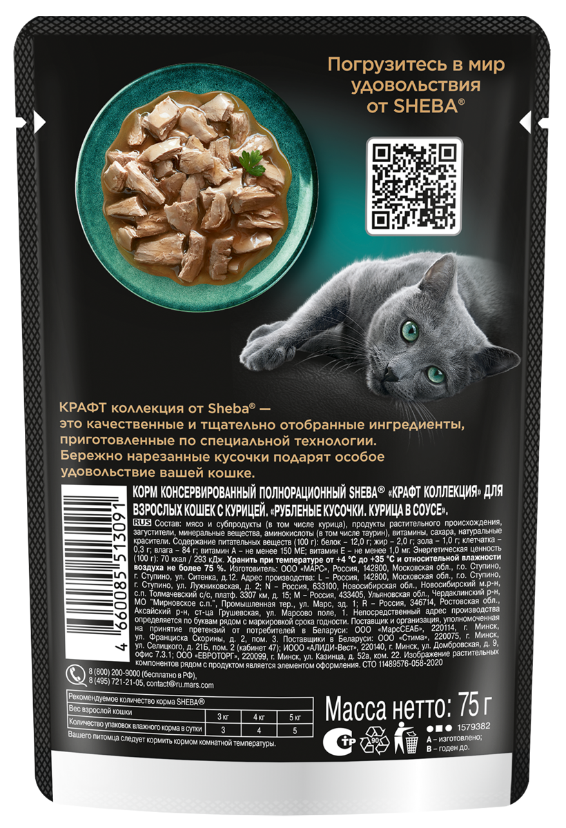 Sheba Влажный корм для кошек (паучи) CRAFT COLLECTION «Сочные слайсы. Курица в соусе» 1023150710244564 0,075 кг 51114 (18 шт)
