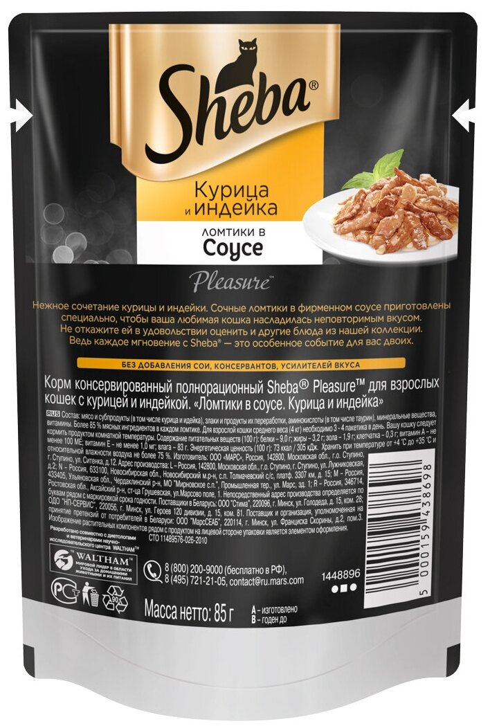 Корм консервированный полнорационный Sheba Pleasure для взрослых кошек Ломтики в соусе. Курица и индейка, 85г, 24 шт