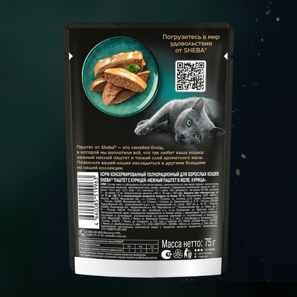 | Дополнительная информация | блюда SHEBA® в том числе подходят и для стерилизованных кошек и котов, для таких питомцев мы рекомендуем сократить количество корма на 20% в сравнении с базовой рекомендацией |