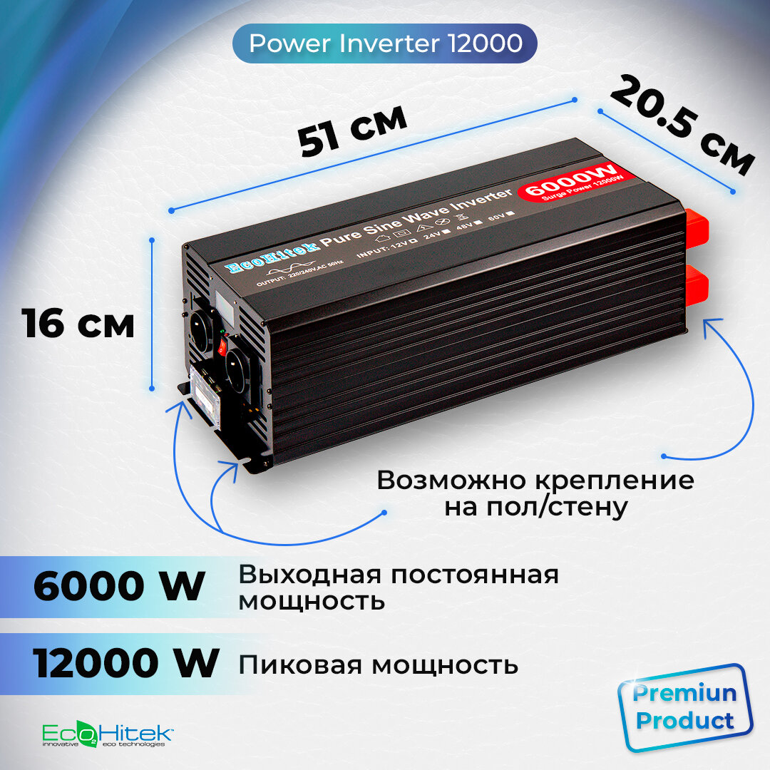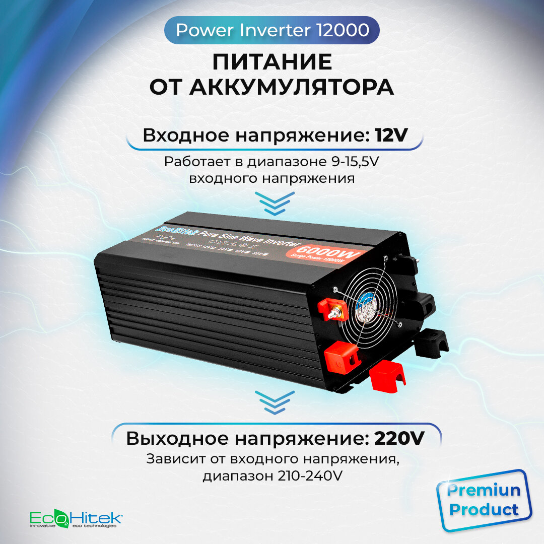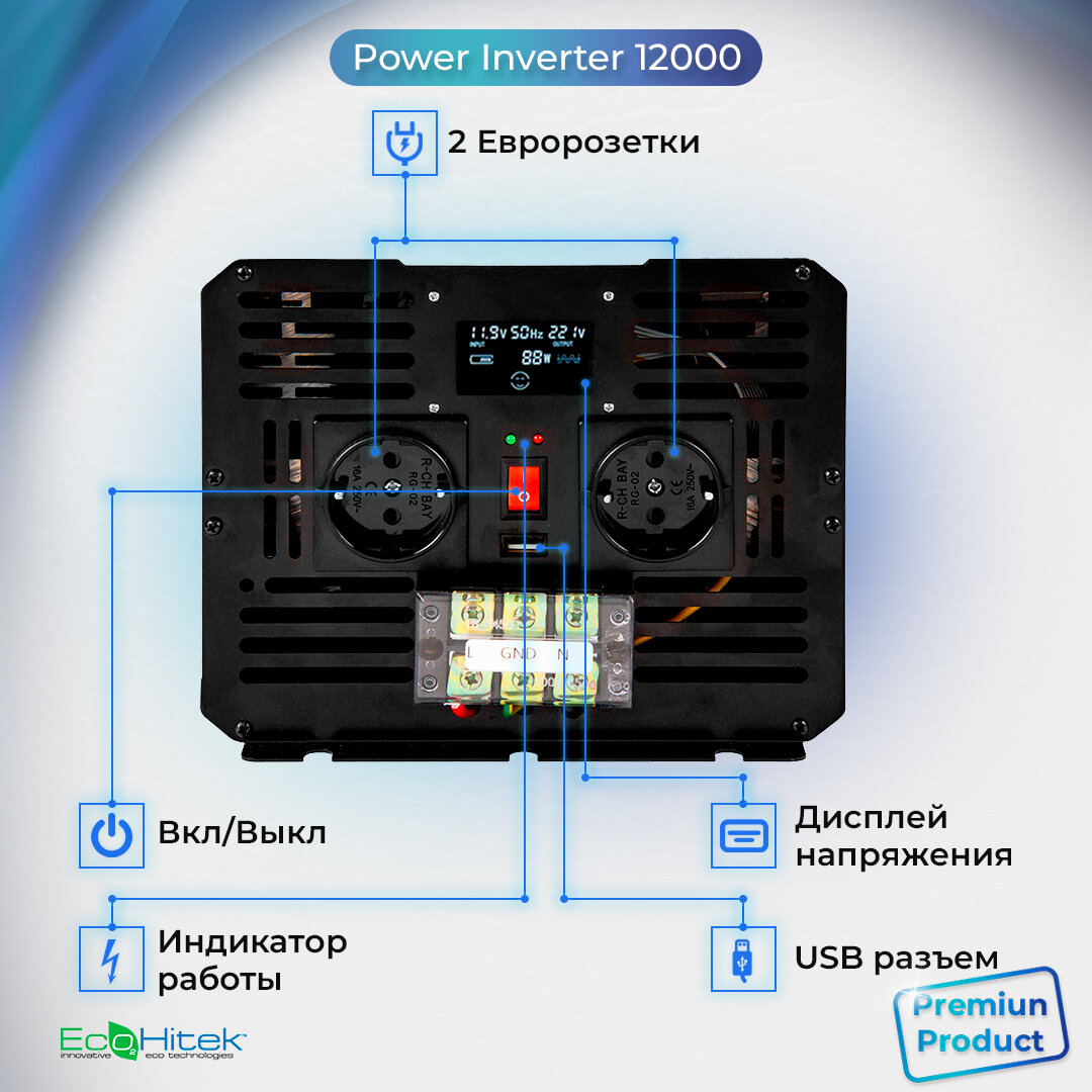 Купить Power Inverter 12'000 EcoHitek Автомобильный инвертор напряжения 12 - 220В (пост нагрузка до 6'000 Вт). Подключение приборов, эл. инструмента.