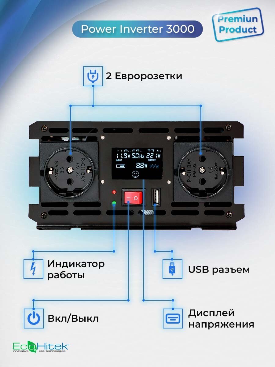 Power Inverter 3000 EcoHitek Автомобильный инвертор напряжения 12 - 220В (пост нагрузка до 1500 Вт). Подключение приборов, эл. инструмента. интересное: