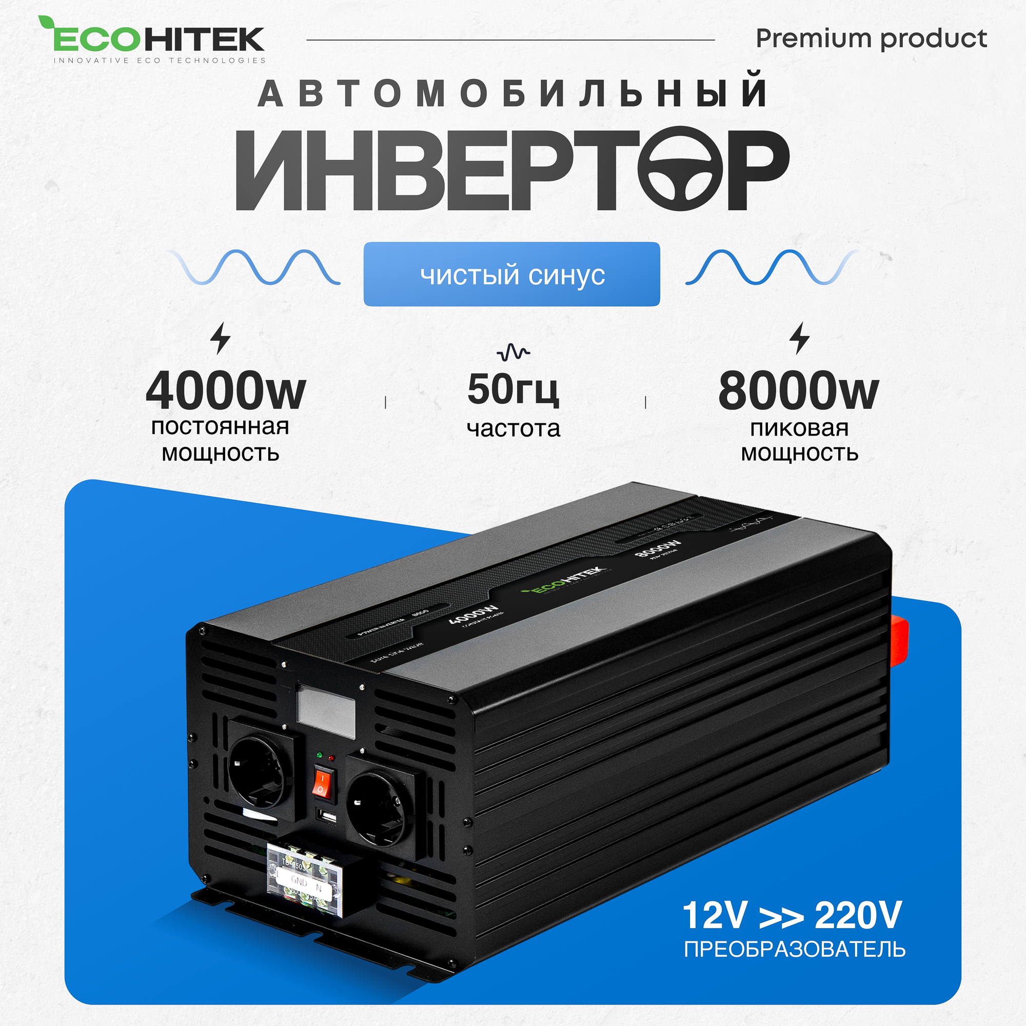 Купить Power Inverter 8000 EcoHitek Автомобильный инвертор напряжения 12 - 220В (пост нагрузка до 4000 Вт). Подключение приборов, эл. инструмента.