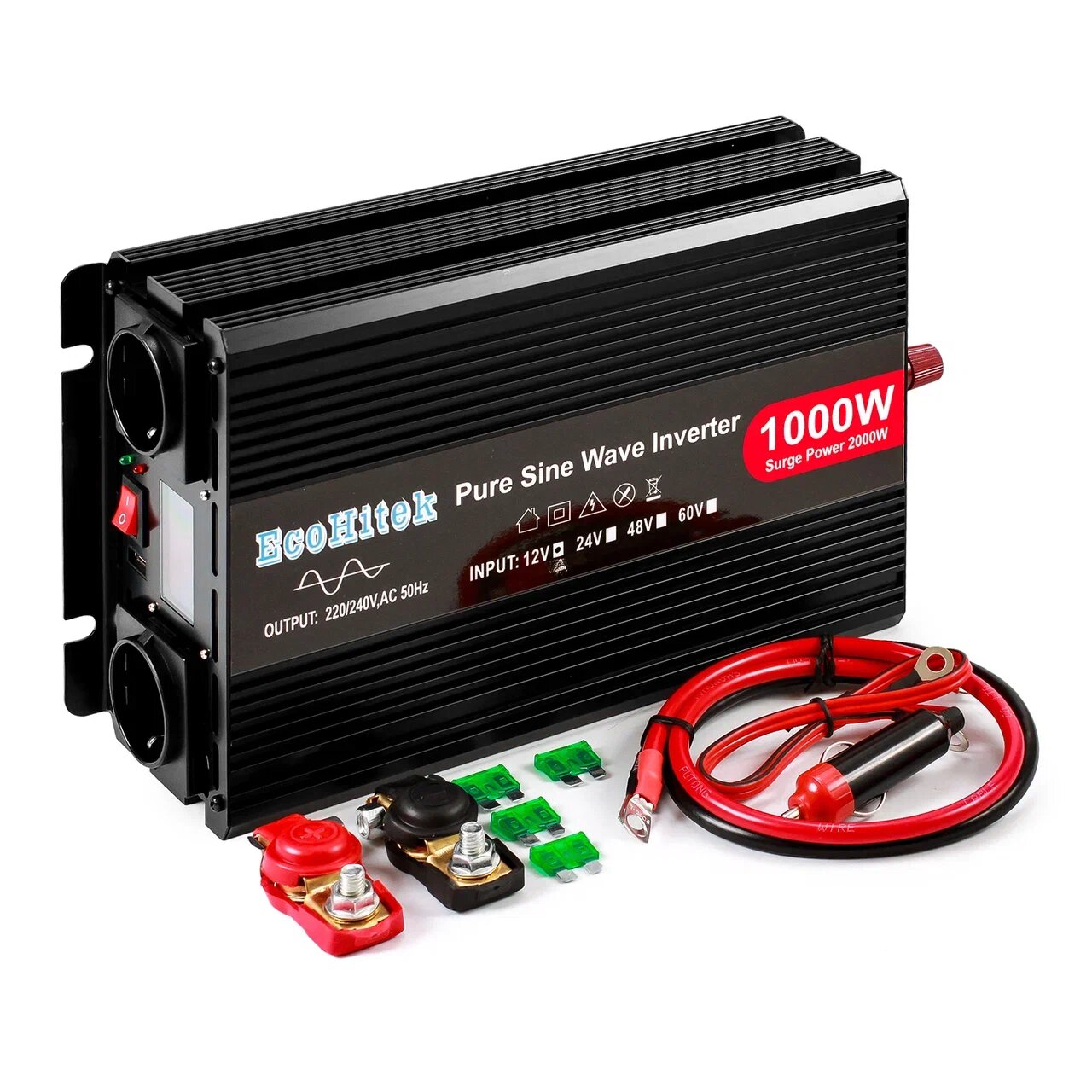 Инвертор автомобильный 12 220В с функцией зарядки аккумулятора. 2000Вт (пост нагруз до 1000Вт) EcoHitek. Чистый синус. Бесперебойное питание для дома